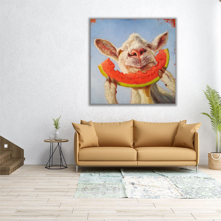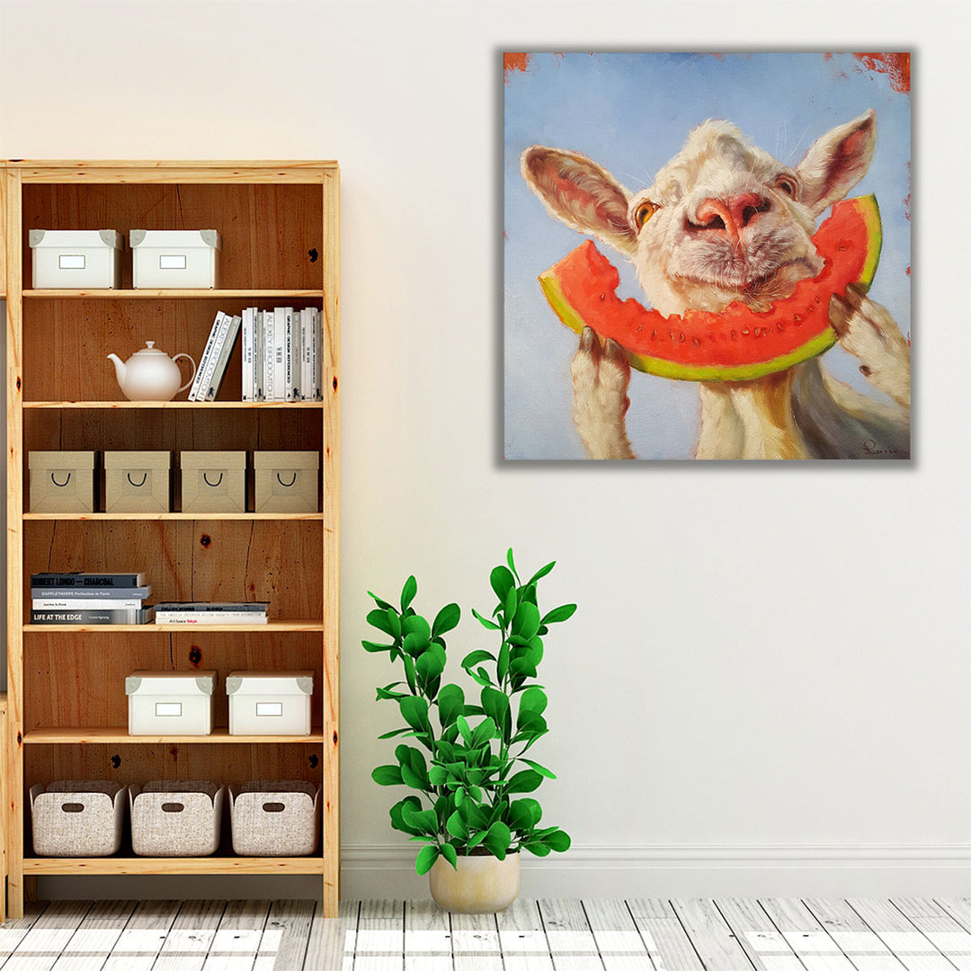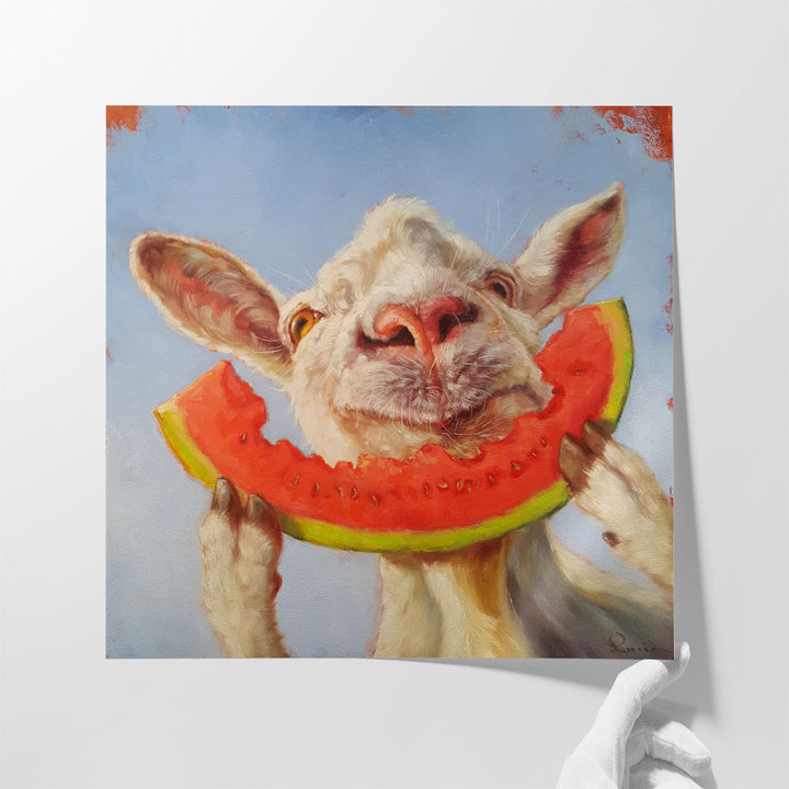 This humorous piece showcases a goat joyfully munching on a watermelon, captured in a realistic and whimsical style.