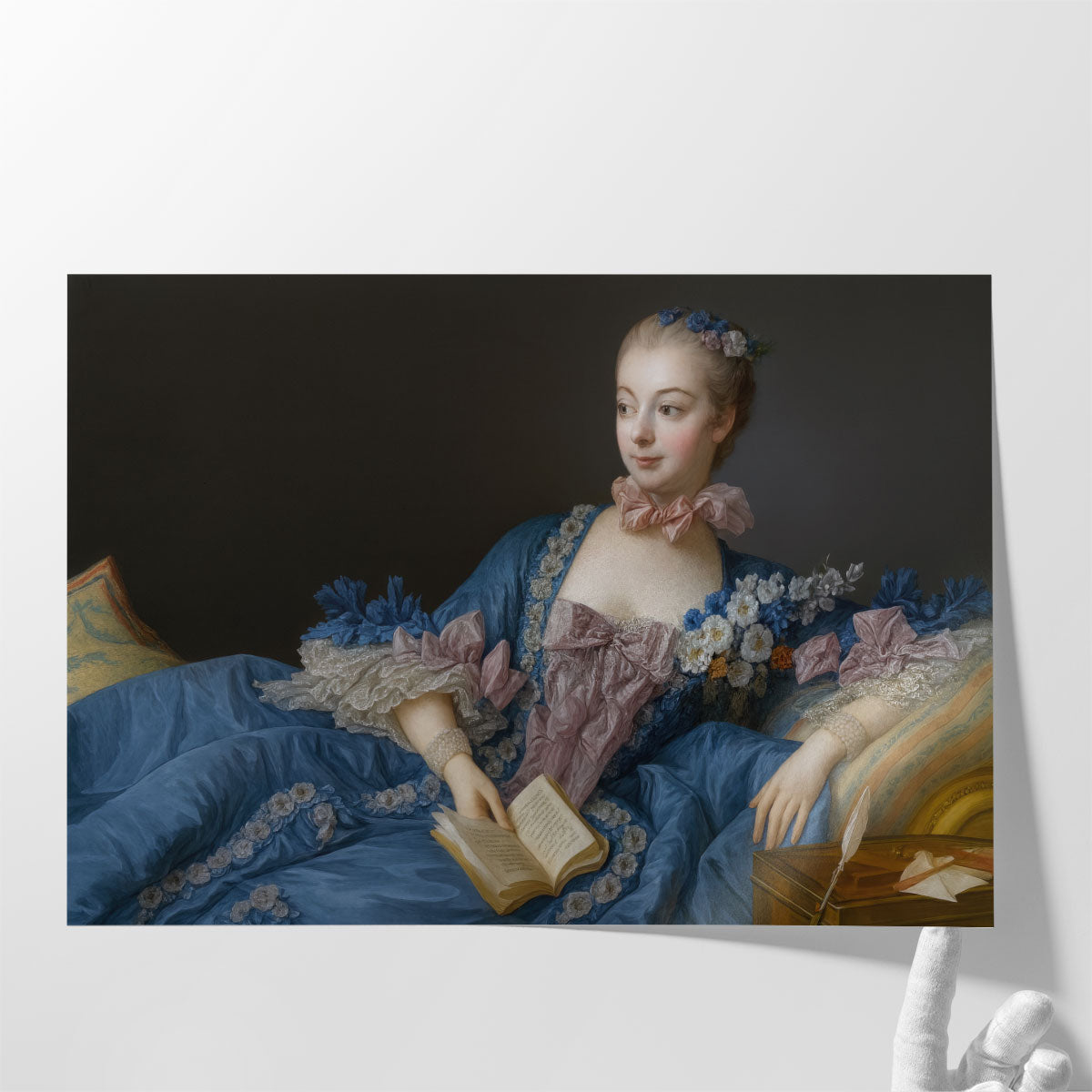 Depicting Pompadour in a blue dress, reclining with a book in hand, the Rococo portrait radiates elegance and intellectual charm.