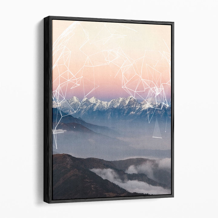 A dramatic interplay of neutral tones and black hues captures majestic mountains beneath drifting clouds in a contemporary scenic view.