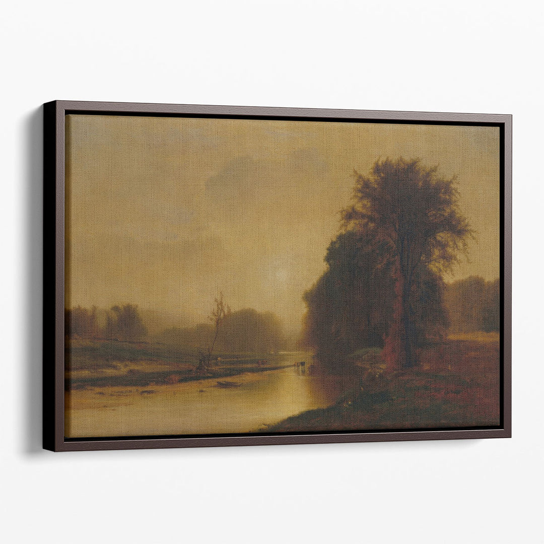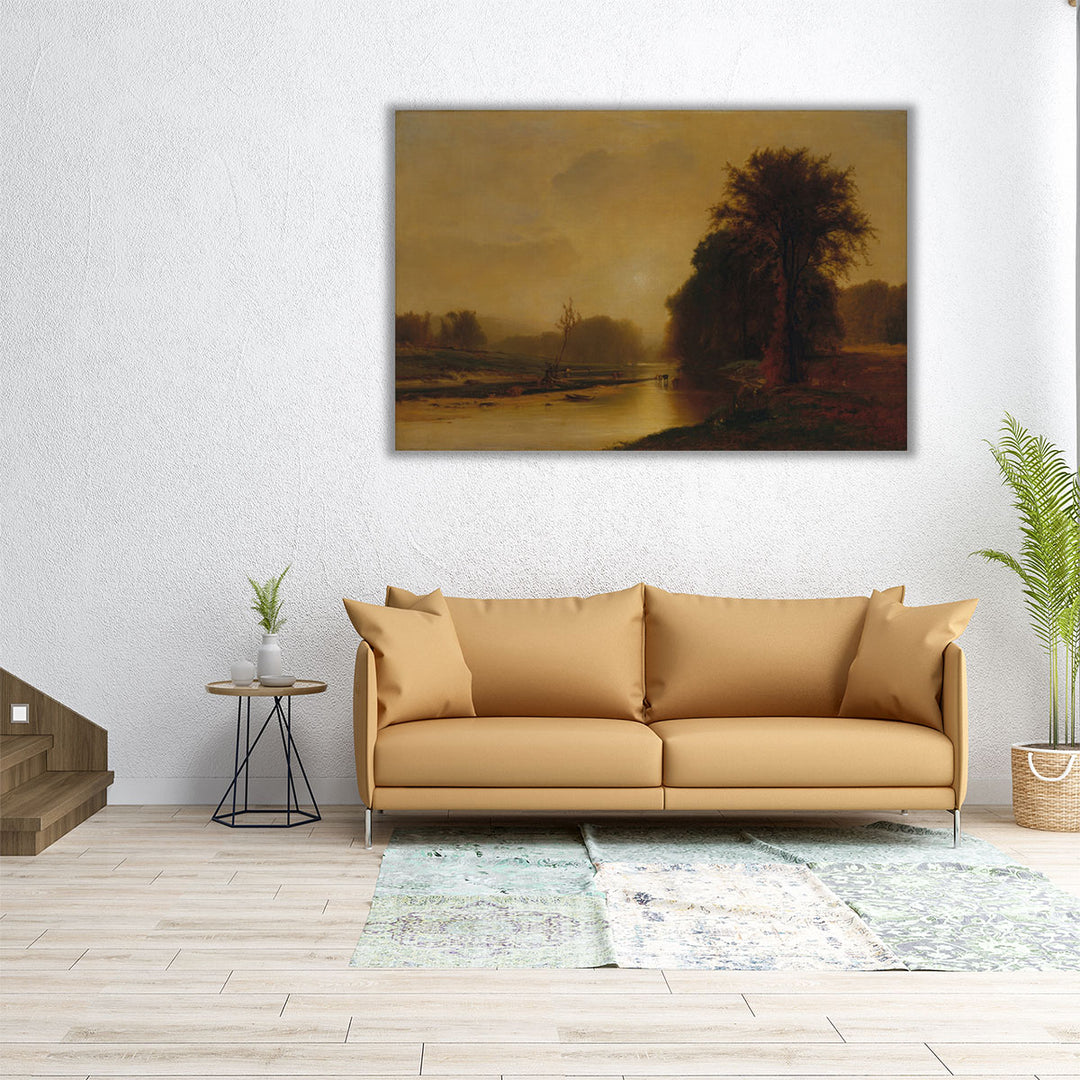 Golden-hued trees and a quiet river weave through a serene classical landscape, evoking rustic charm perfect for a warm-toned living room setting.