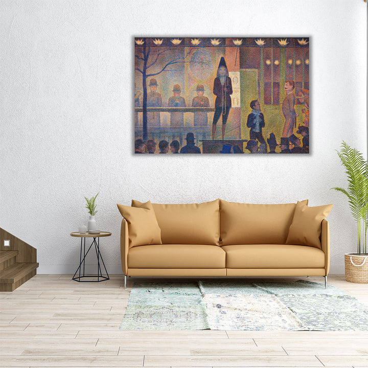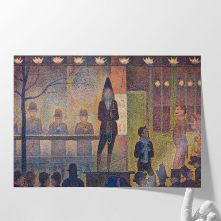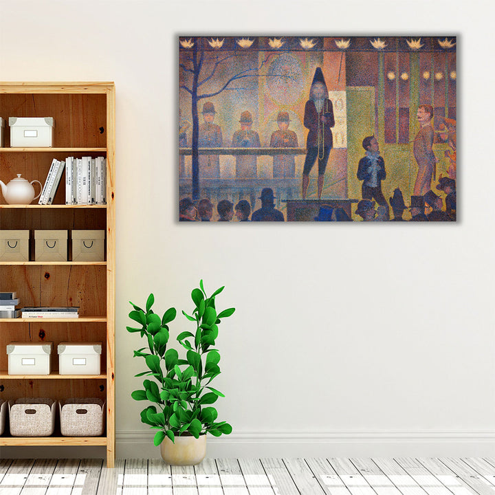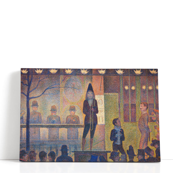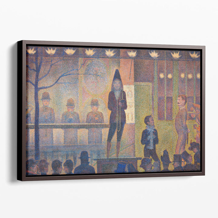 This classic depiction of people in a circus scene blends brown, black, and neutral hues with Seurat’s refined style and delicate pointillist technique.