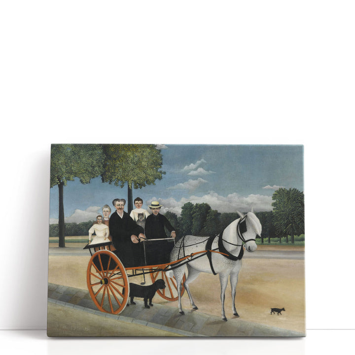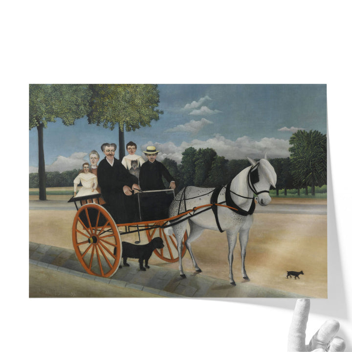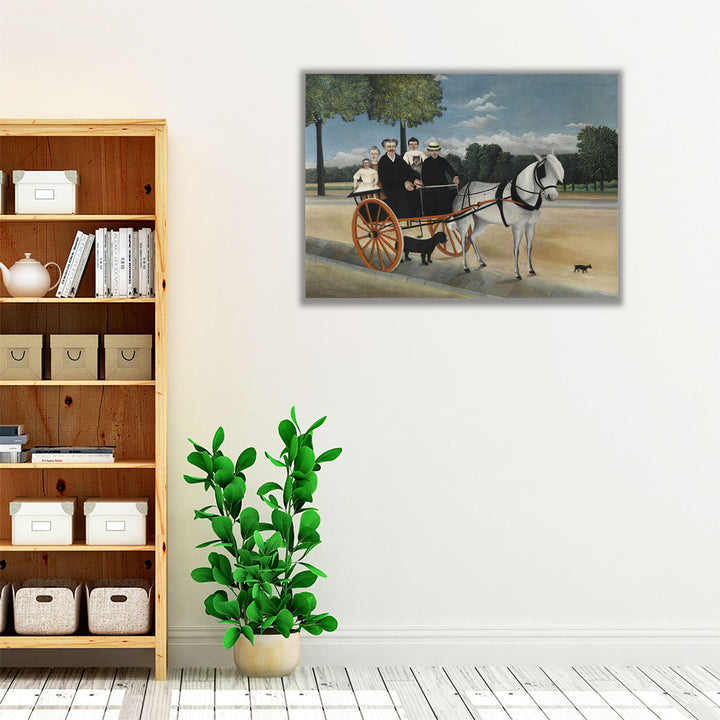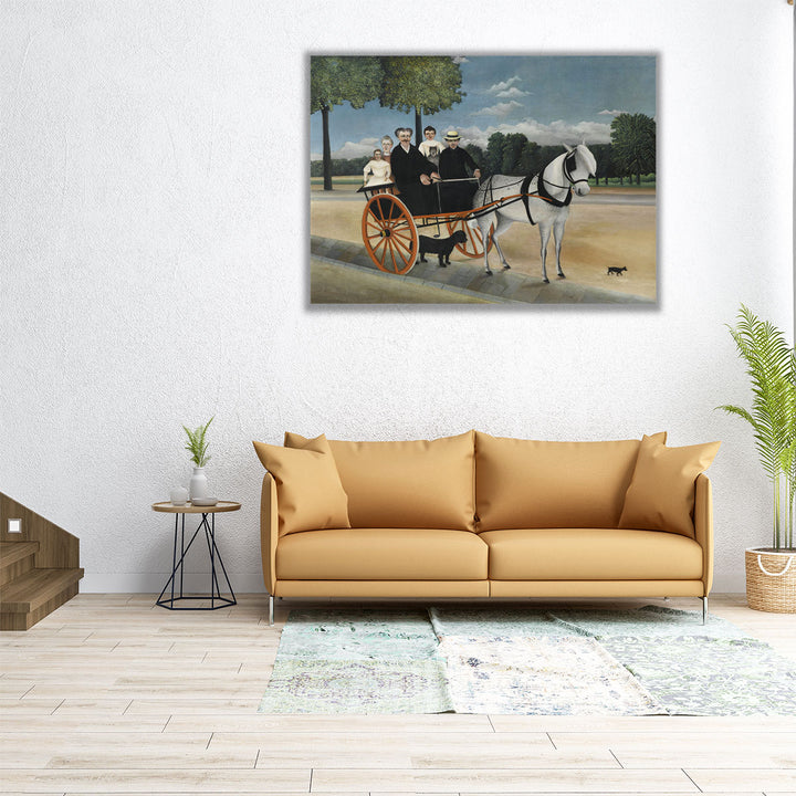 A classic scene of a horse cart with people amid lush green trees, painted in neutral and black tones with Rousseau’s distinct, timeless style.