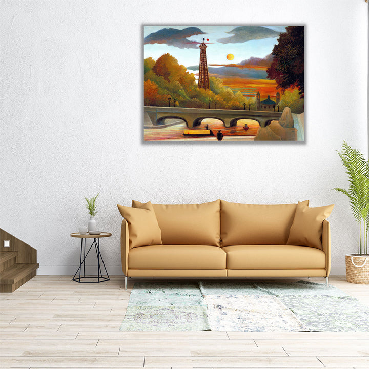 A classic scene featuring trees, a sunset sky, and a bridge, blending orange, green, and neutral tones in Rousseau’s timeless artistic style.