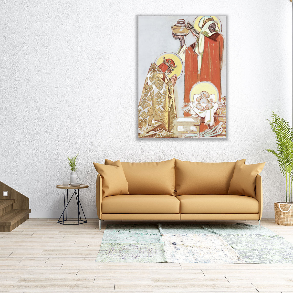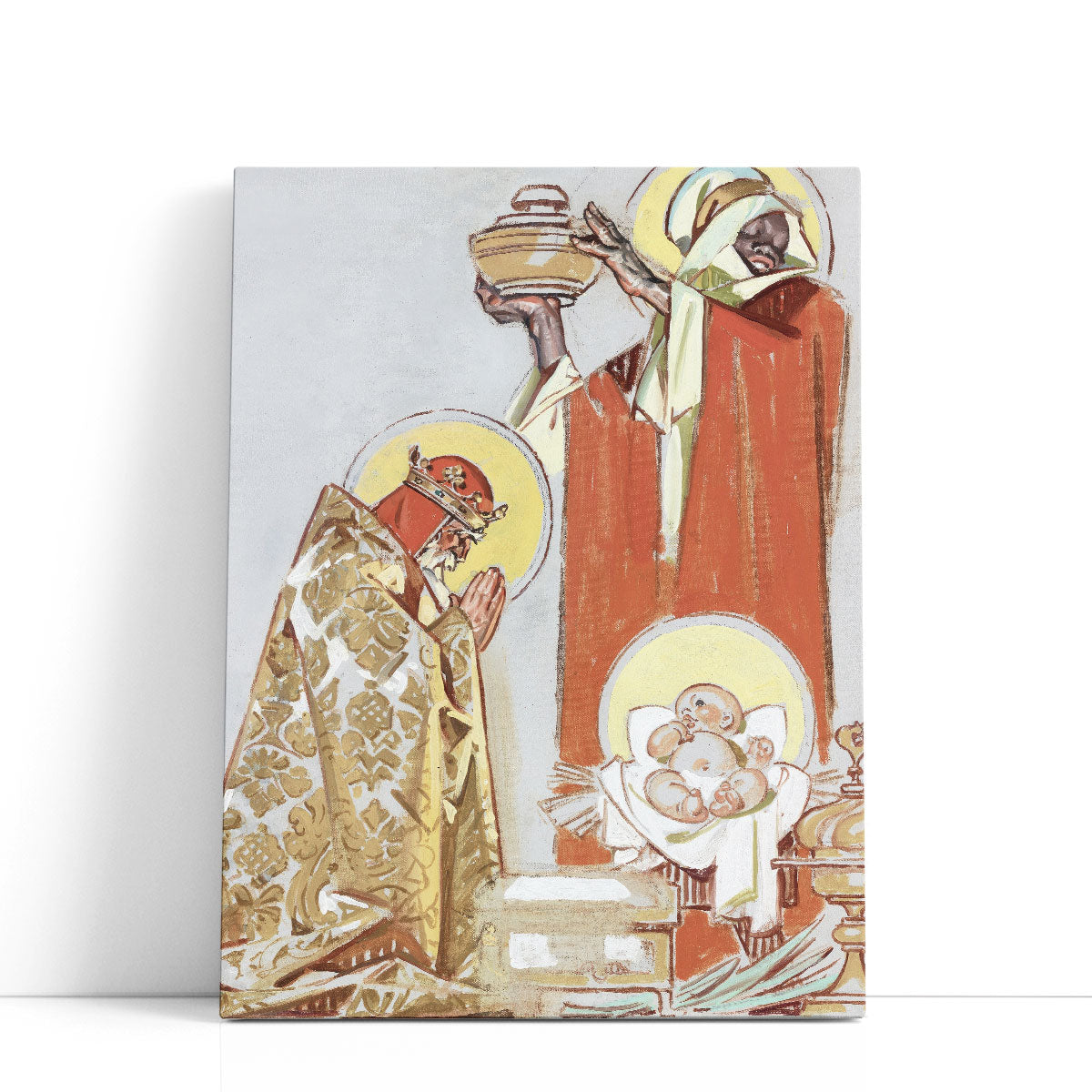 This sacred artwork depicts two Magi presenting gifts to the infant Jesus, rendered in a devotional style with symbolic reverence and detail.