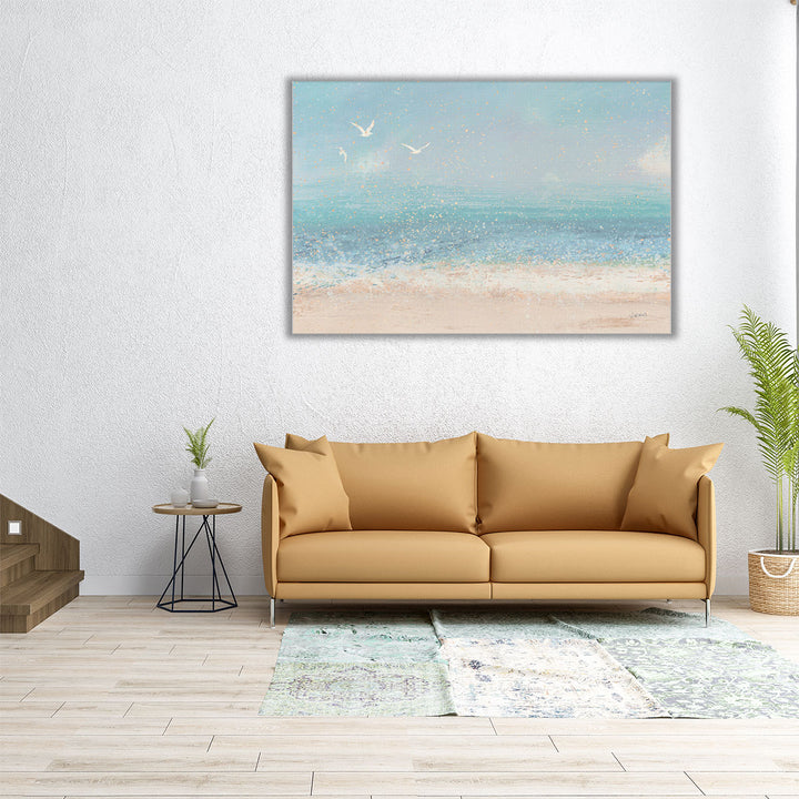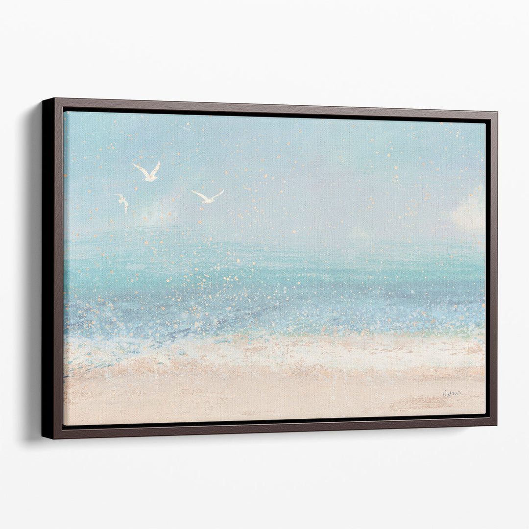 This artwork features an ocean scenery with white birds soaring in the sky, blending calming blue and earthy brown tones for a peaceful coastal vibe.