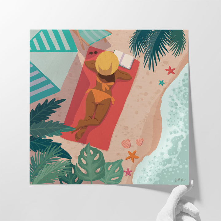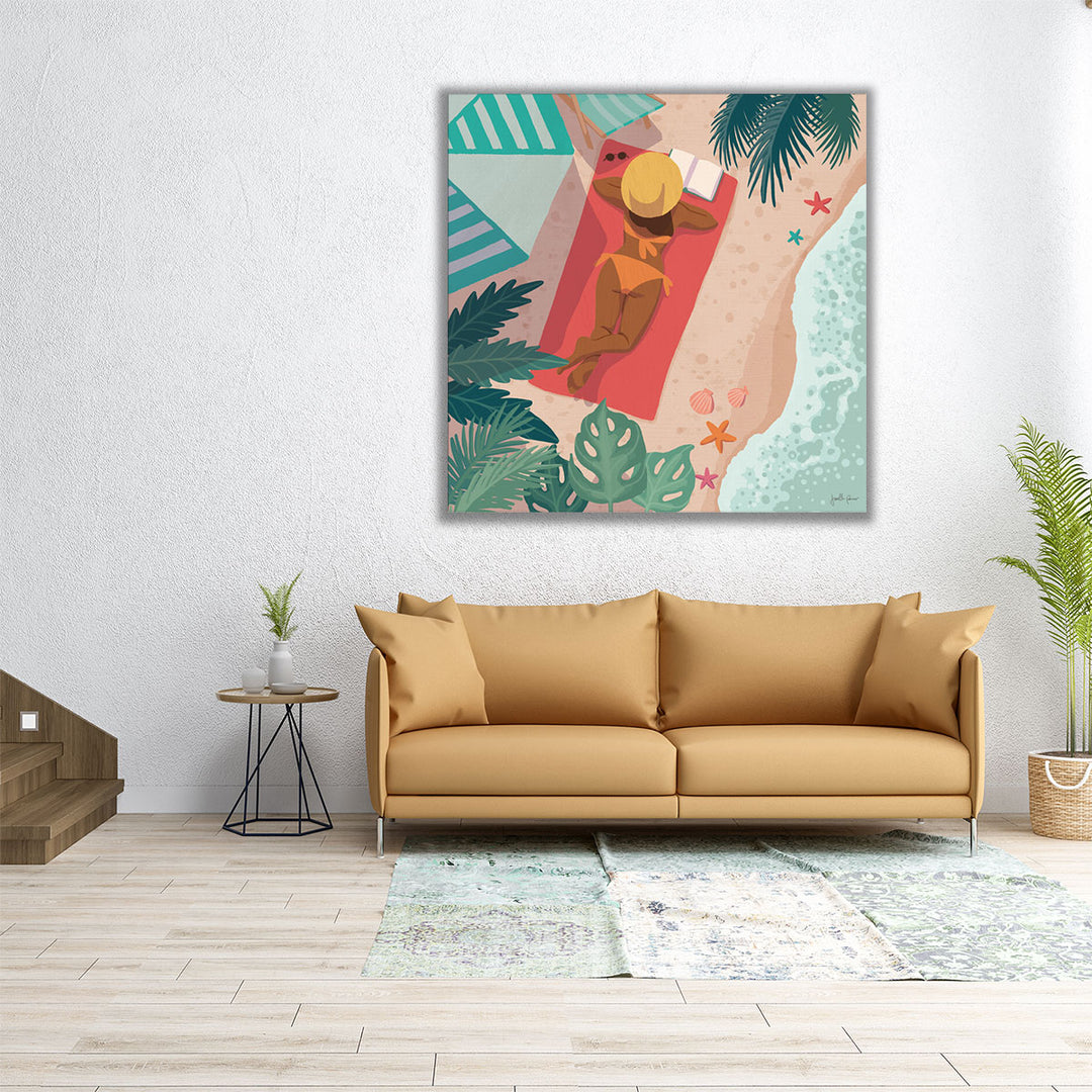 This serene art piece captures a girl reading a book while relaxing on the beach, embodying calm and tranquility in a beautifully captured scene.