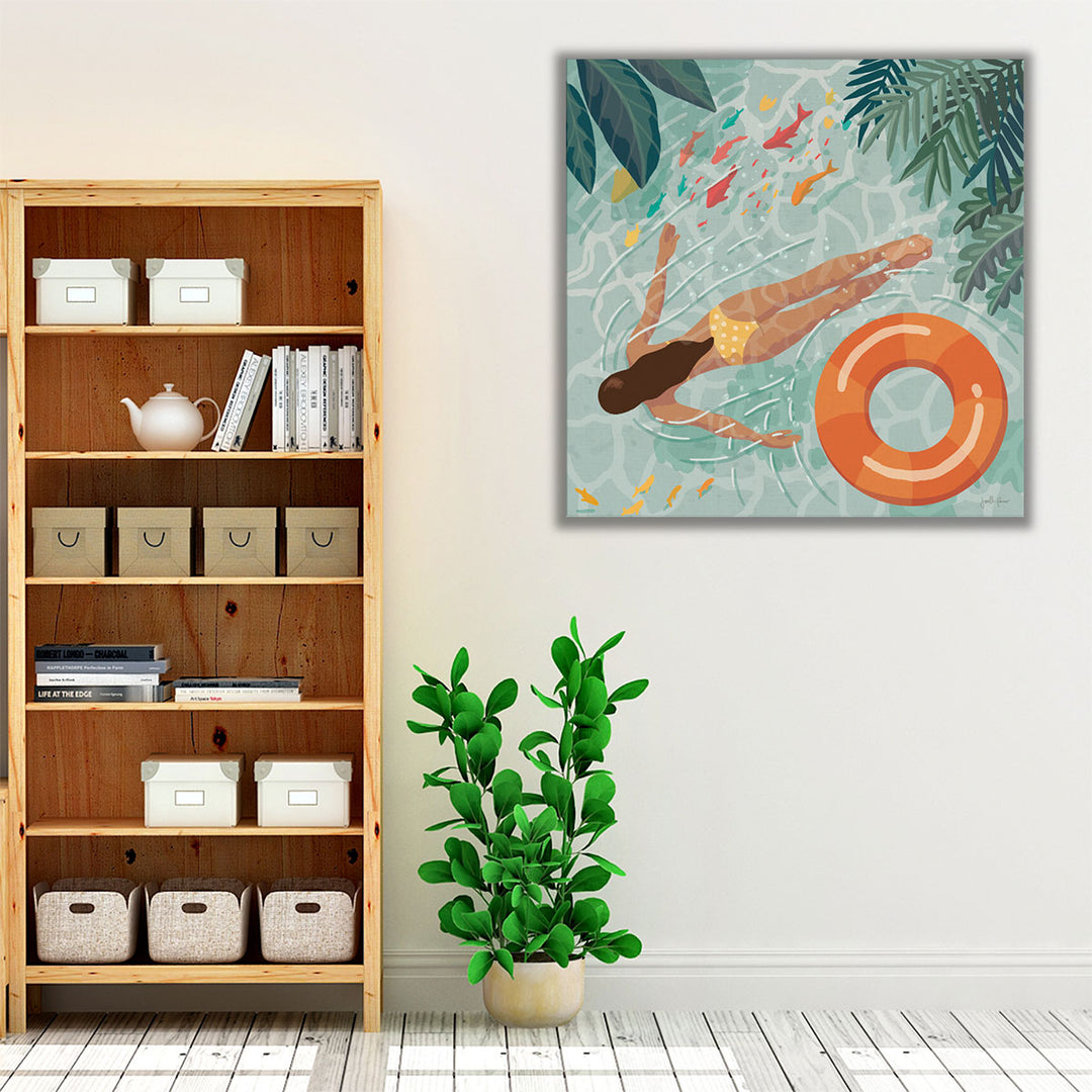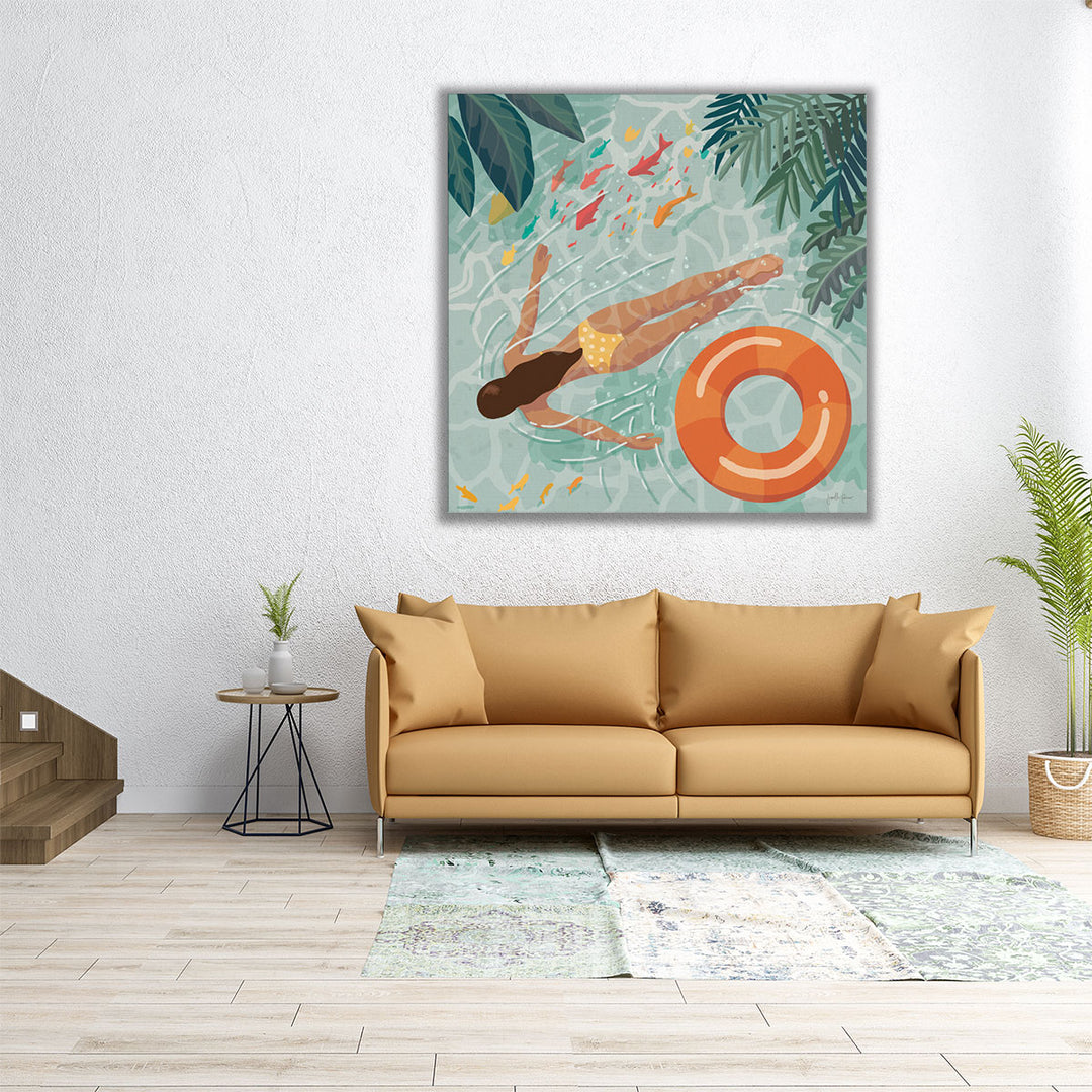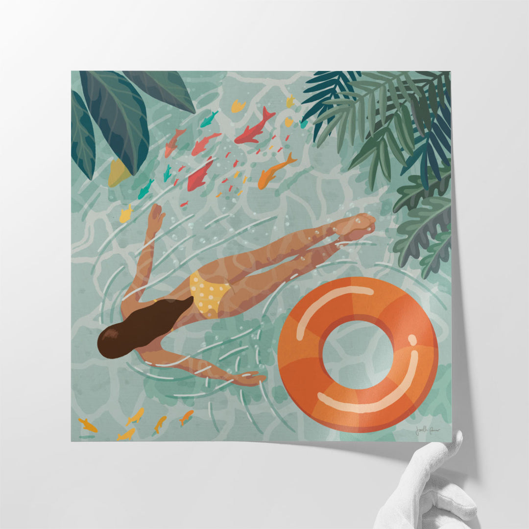 This artwork captures a serene moment of a girl swimming, exuding calmness and celebrating summer vibes.