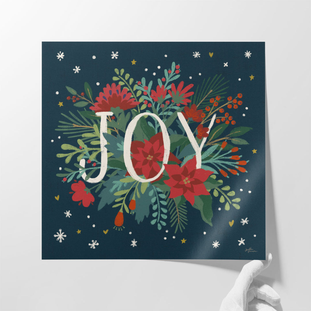 A festive piece showcasing "JOY" text with elegant flowers on a blue background, perfect for adding holiday charm to your decor.