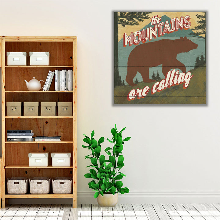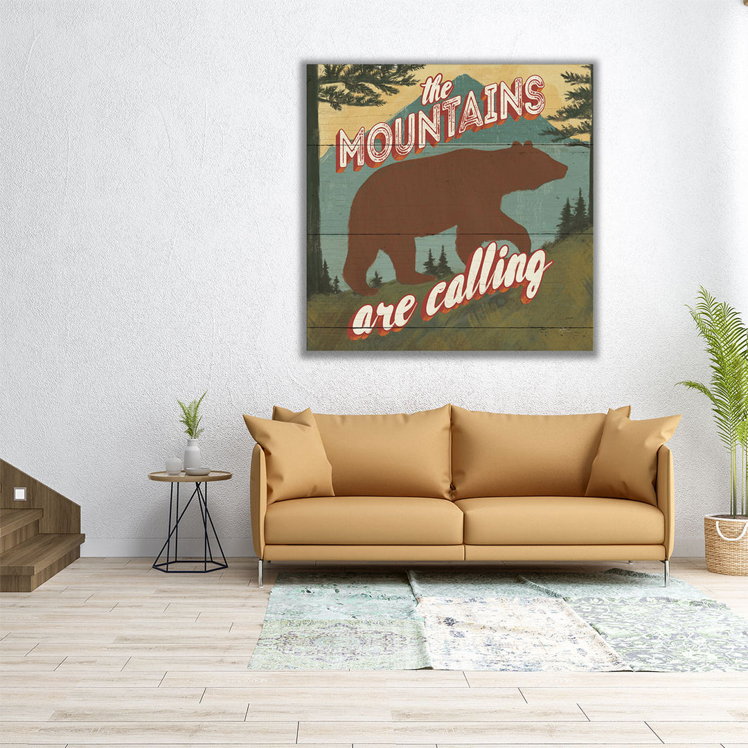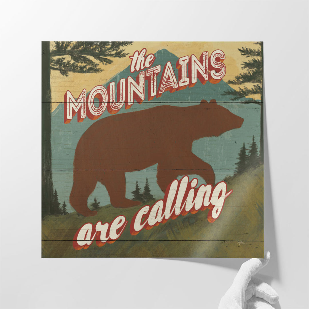 This stunning artwork features a majestic brown bear with the text "The mountains are calling," perfect for nature lovers and rustic spaces.