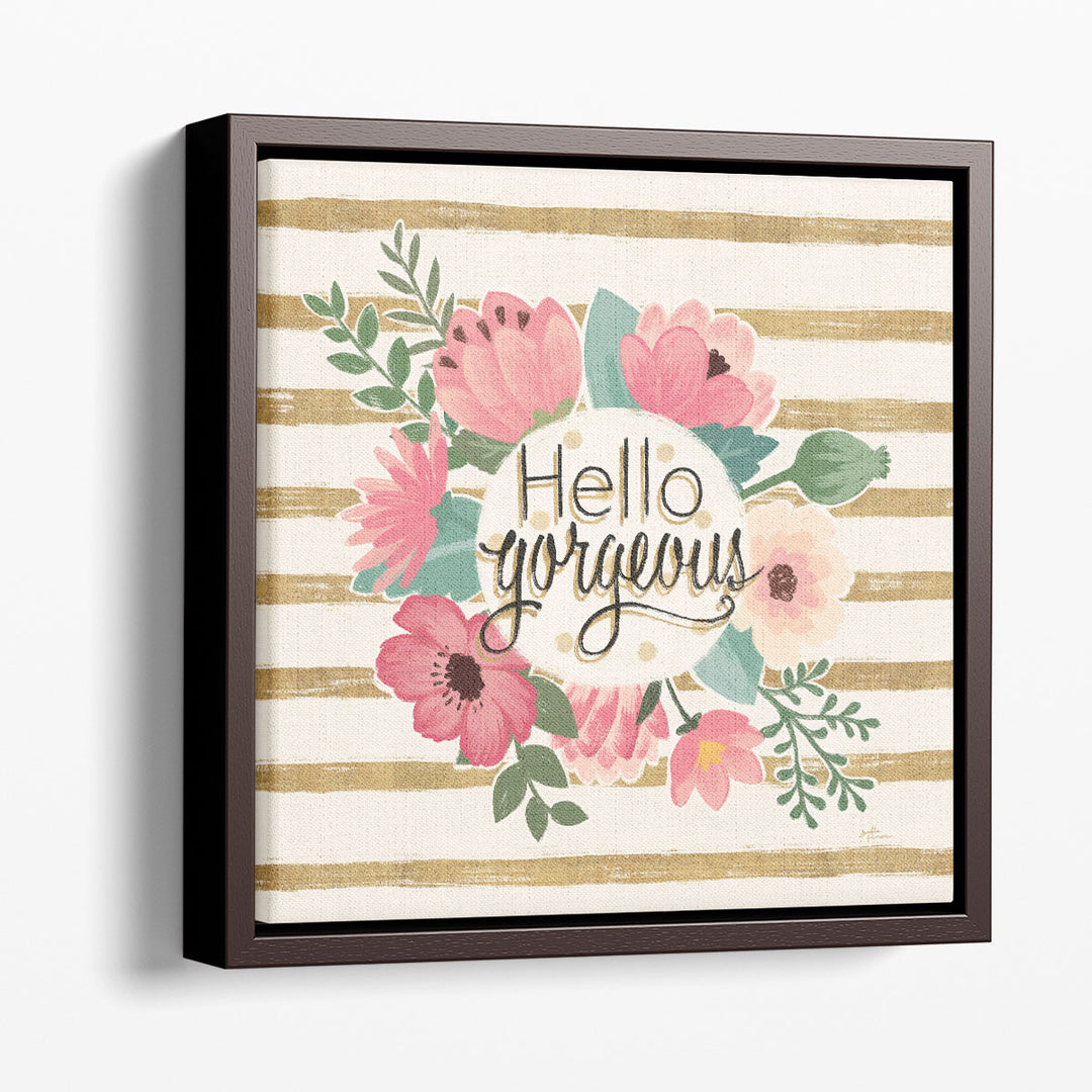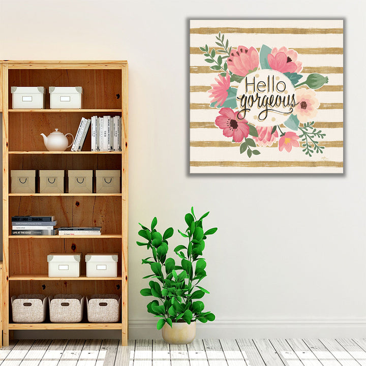 This vibrant piece showcases the text "Hello Gorgeous" surrounded by beautiful floral designs, perfect for adding charm to any space.