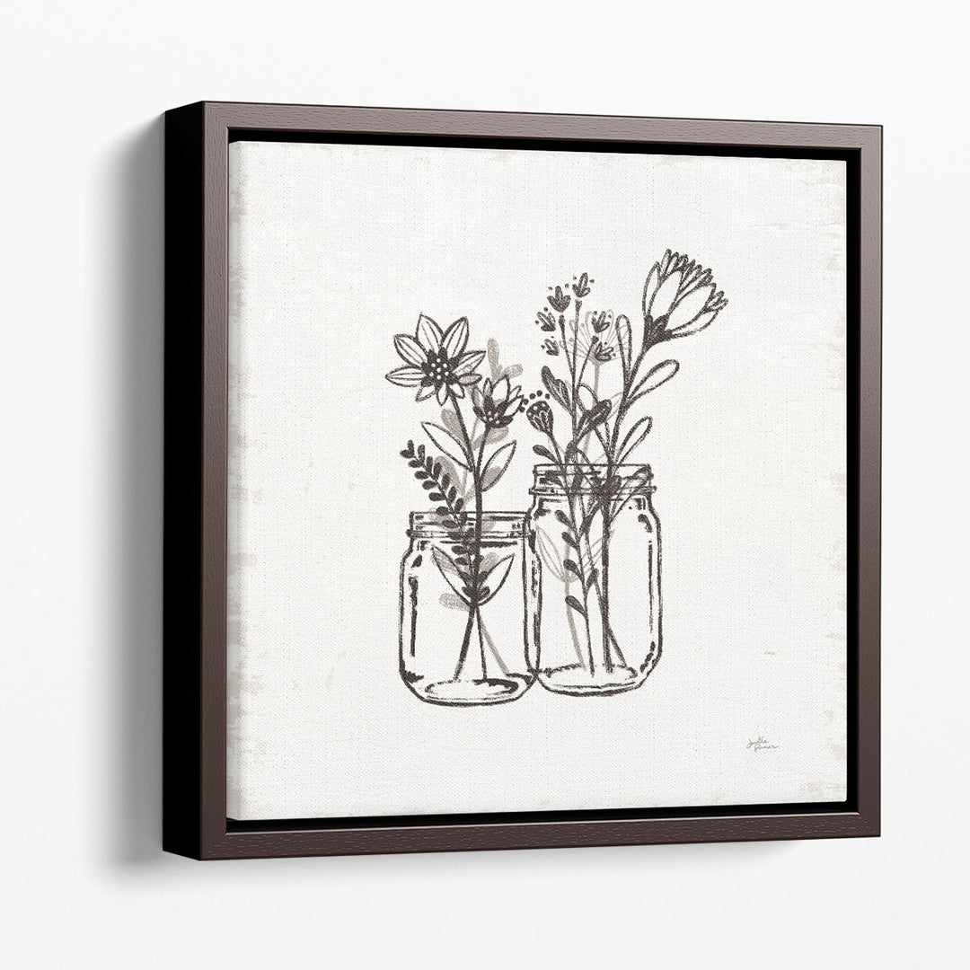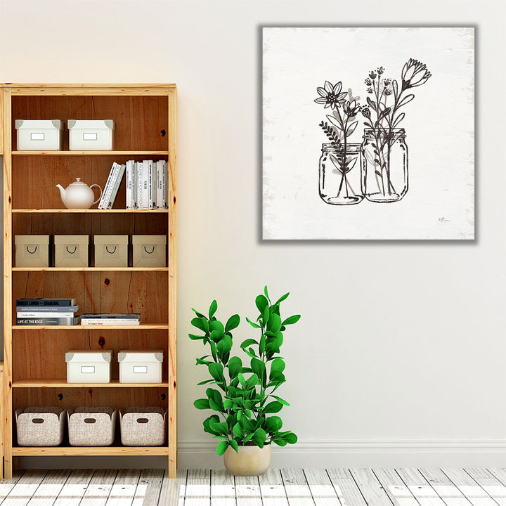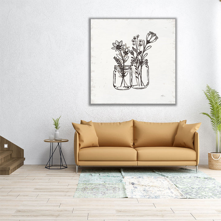 This charming artwork showcases two jars with flowers, exuding a rustic and floral appeal perfect for any cozy home décor setting.