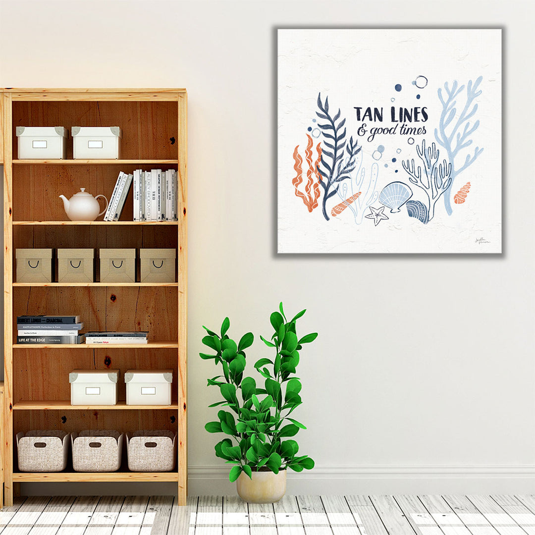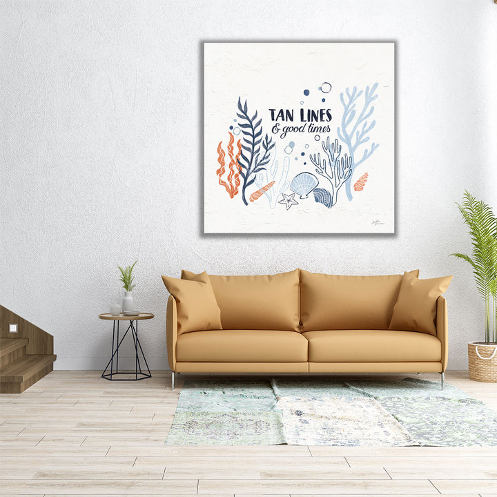 This beautiful artwork highlights sea plants, starfish, and seashells in a harmonious blue and orange palette, featuring uplifting "tan lines and good times" typography.