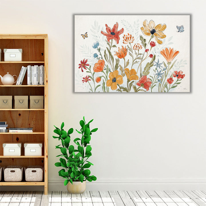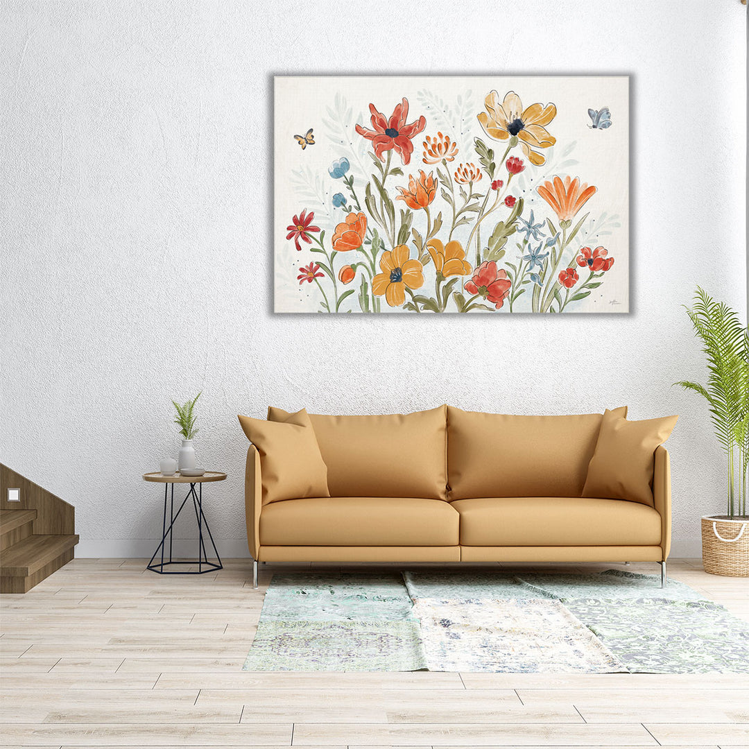 This vibrant canvas wall art features a beautiful blend of yellow, red, and orange flowers, adding warmth and color to any space.