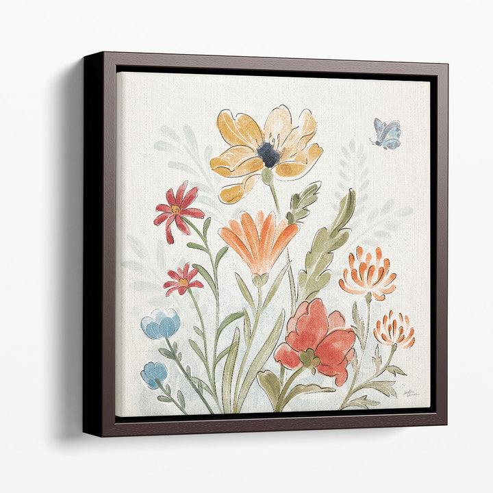 A vibrant display of red, yellow, and orange flowers, this artwork radiates warmth and adds a lively floral touch to any room.