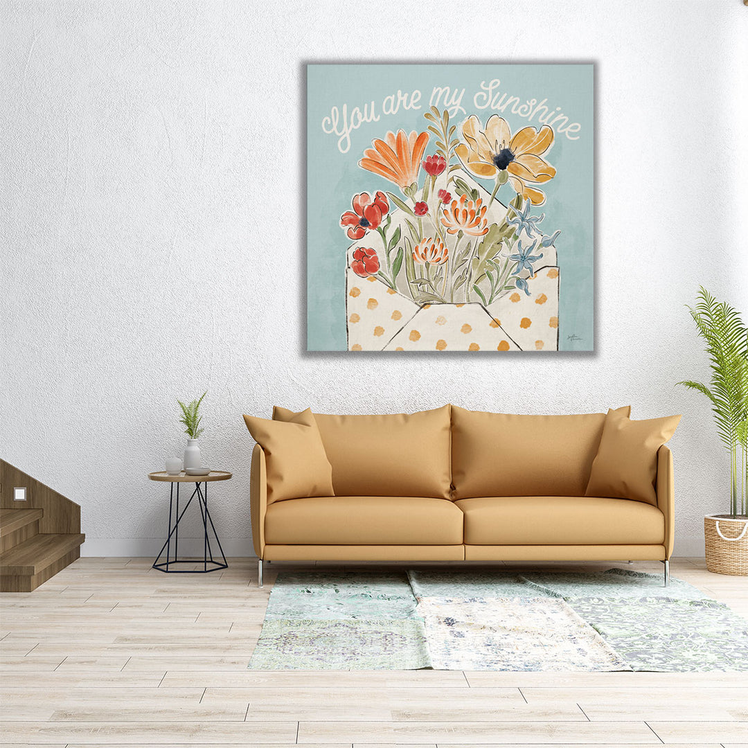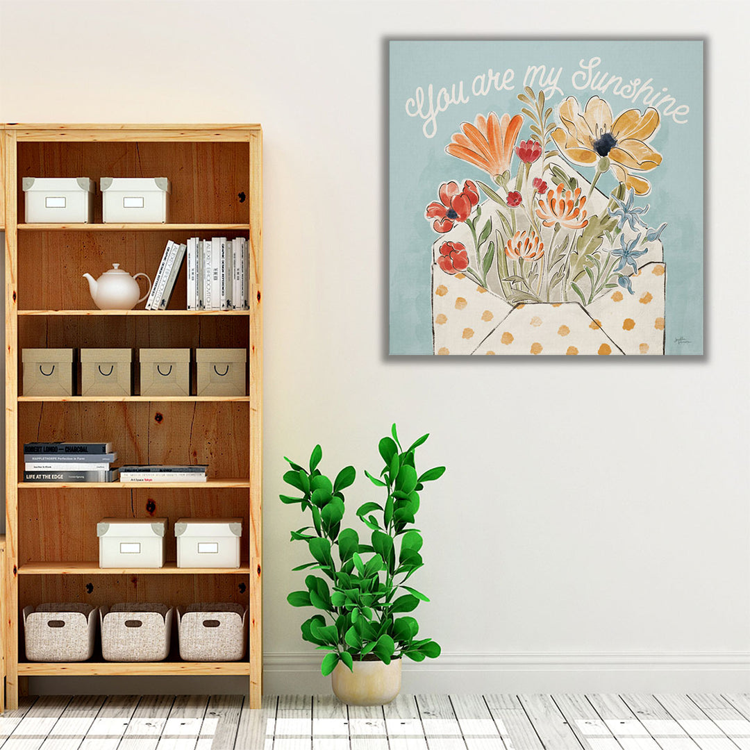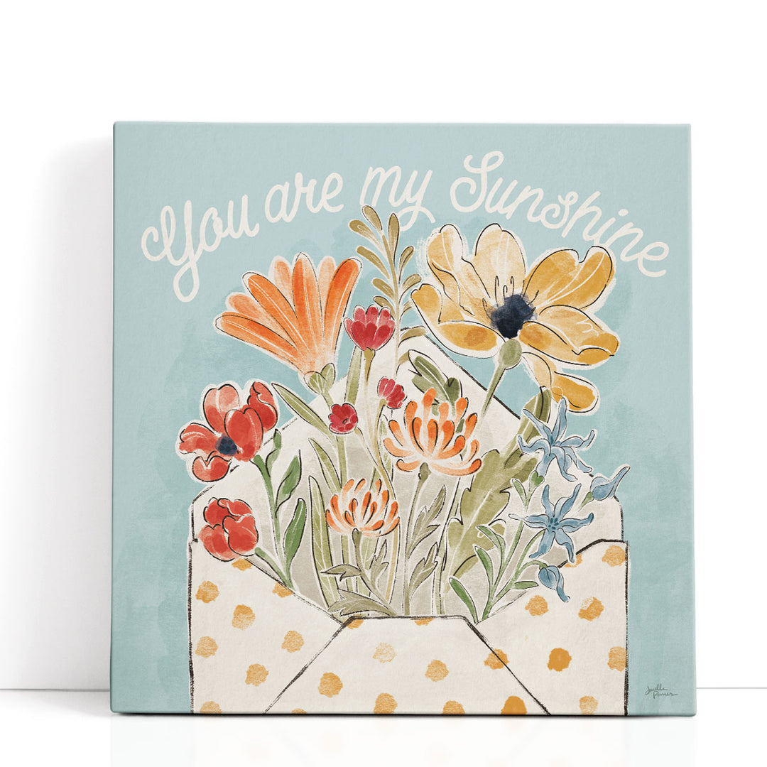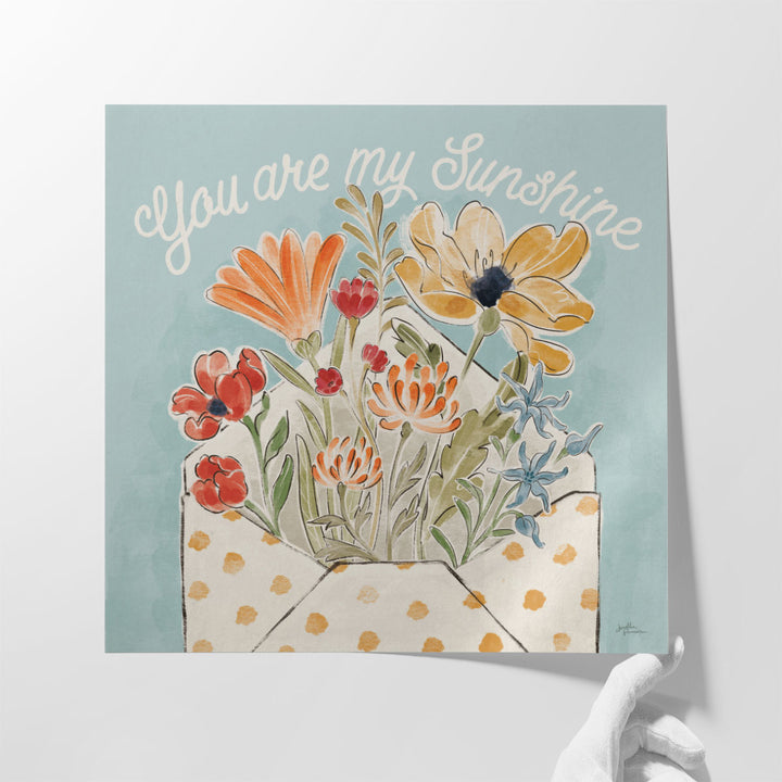 This vibrant artwork showcases red, yellow, and orange flowers in an envelope, featuring the text "You Are My Sunshine," blending warmth and charm.