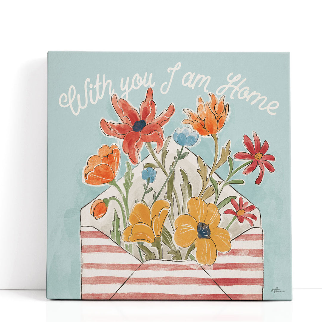 This vibrant artwork showcases red, yellow, and orange flowers in an envelope, paired with the heartfelt text, "With you, I am home."