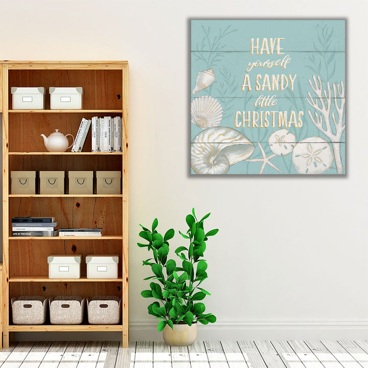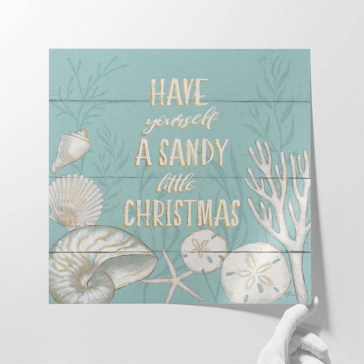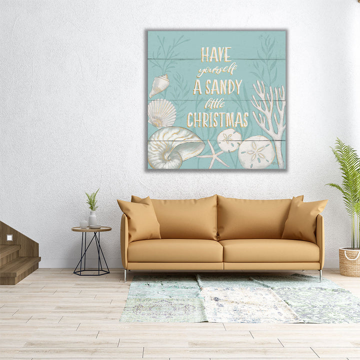 Celebrate the holidays with this charming blue seashell artwork featuring "Have Yourself a Sandy Little Christmas" text, perfect for coastal-themed decor.