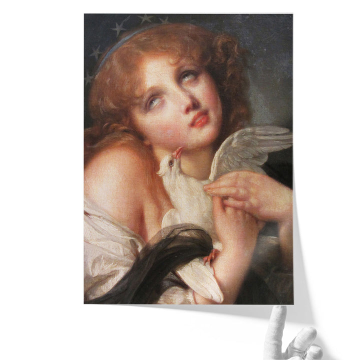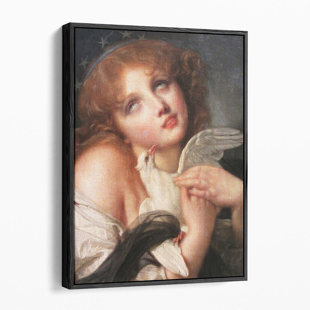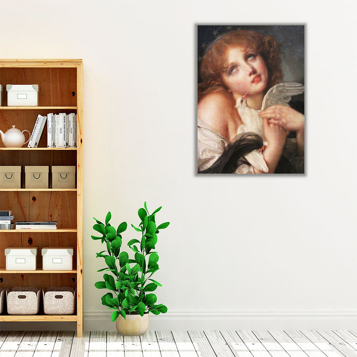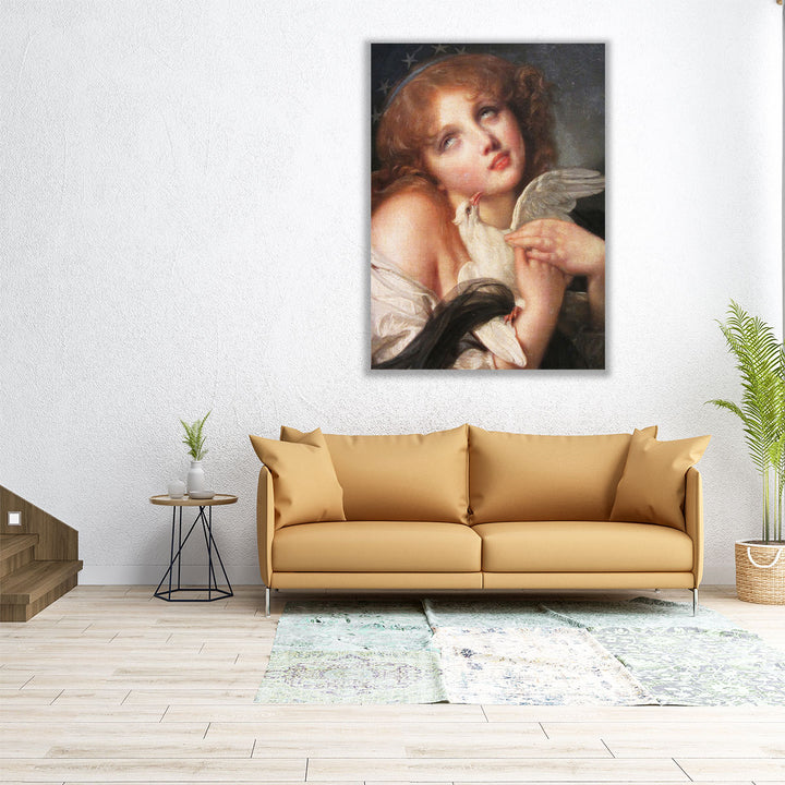 A young woman gently holding a bird is portrayed in classic style with soft gray and neutral tones, evoking quiet elegance and timeless charm.