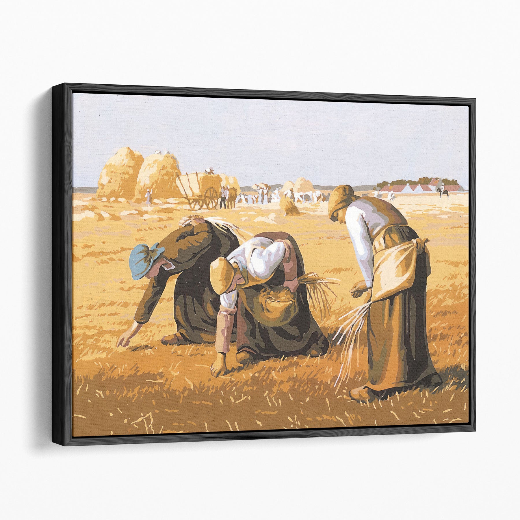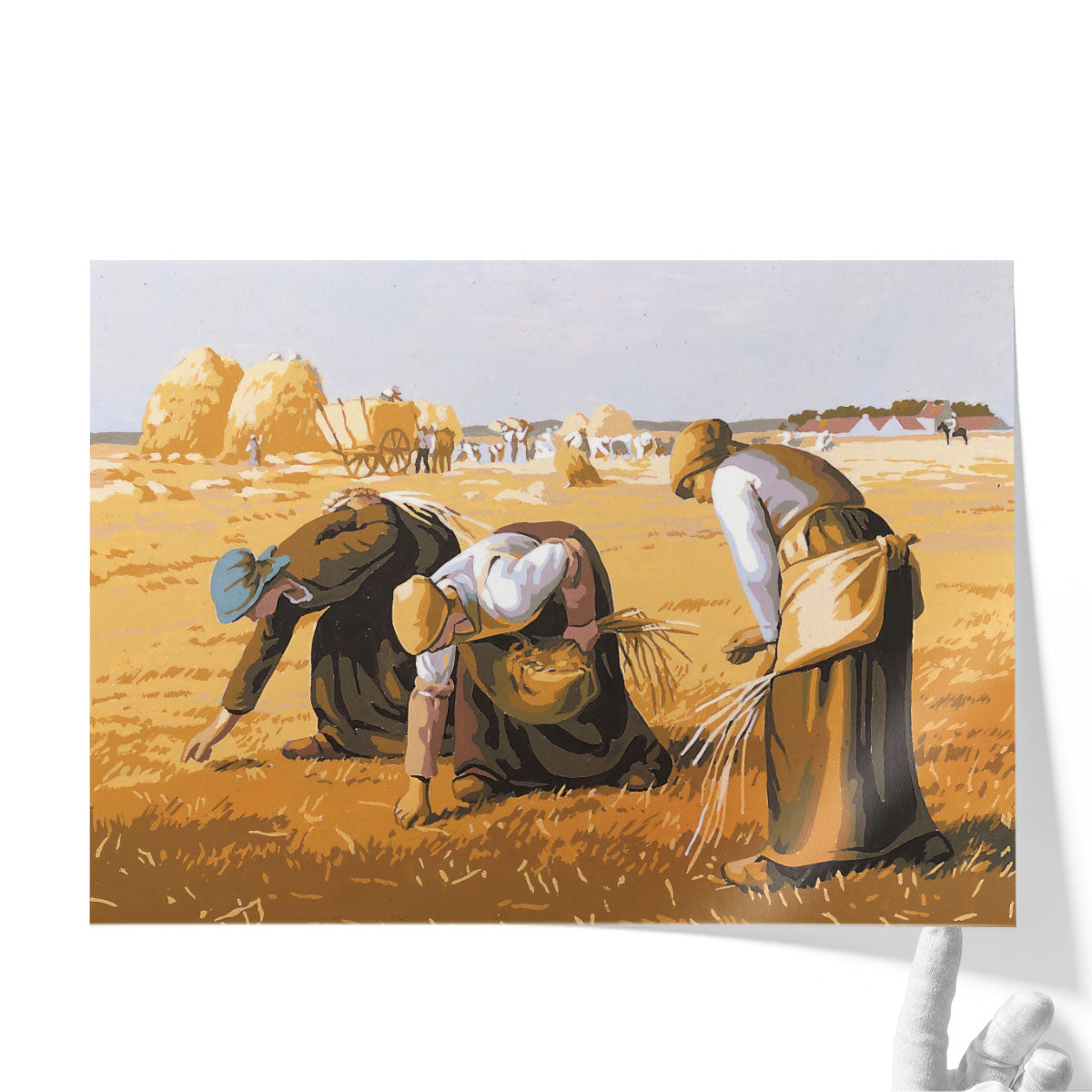 Rural working women gleaning wheat in golden yellow and beige, a rustic French countryside scene with vintage warmth.