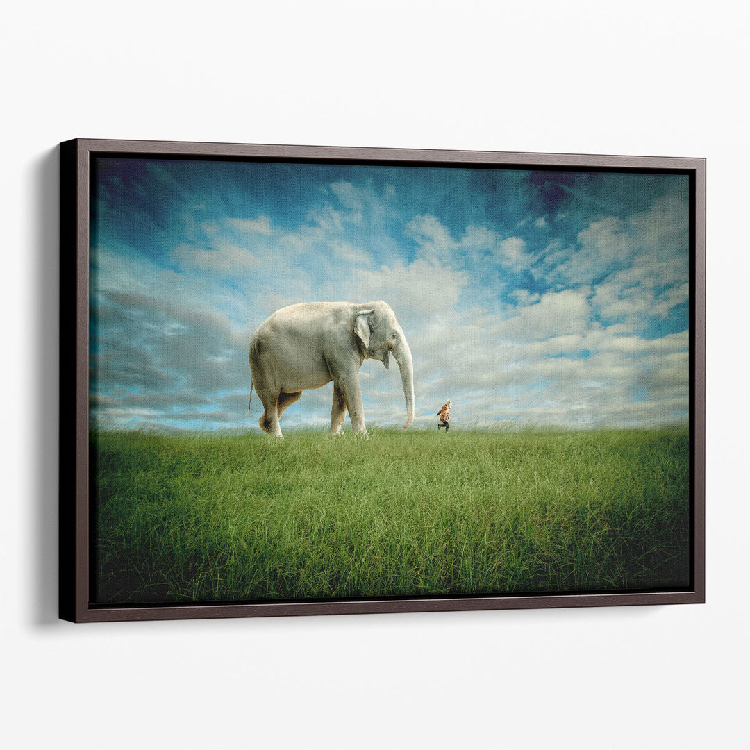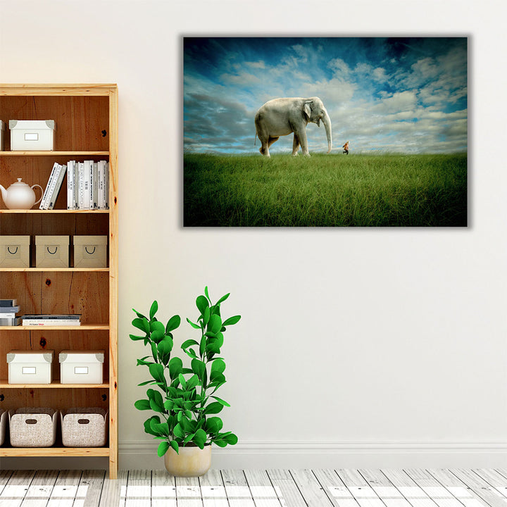 This captivating artwork portrays the gentle bond between a young girl and an elephant, illustrated in a soft, heartwarming style.
