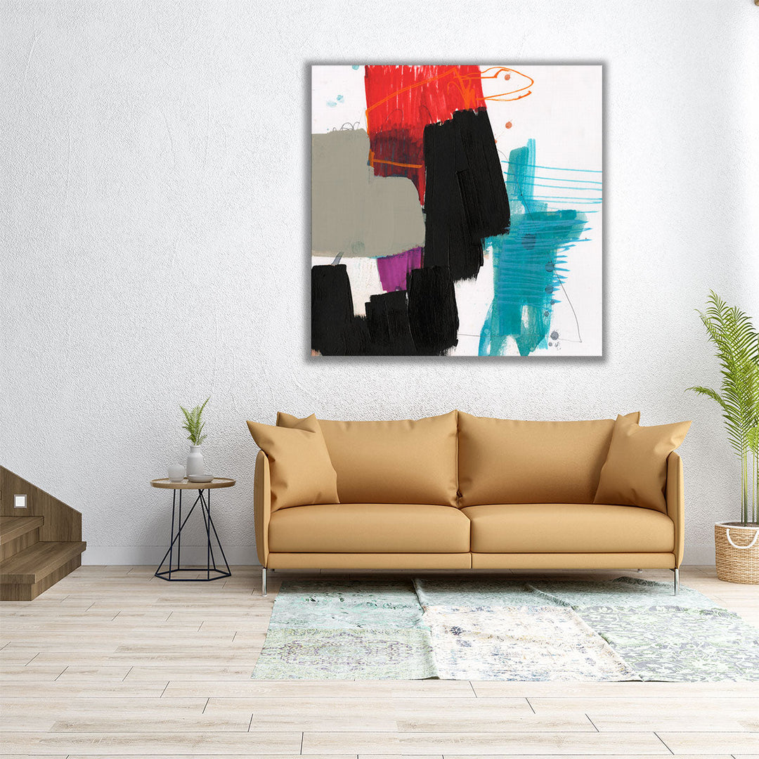 Showcasing a dynamic blend of abstract shapes and bold colors, this piece exudes a modern, vibrant energy ideal for contemporary settings.