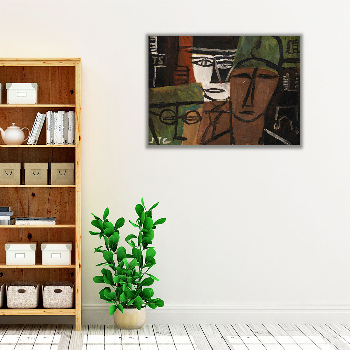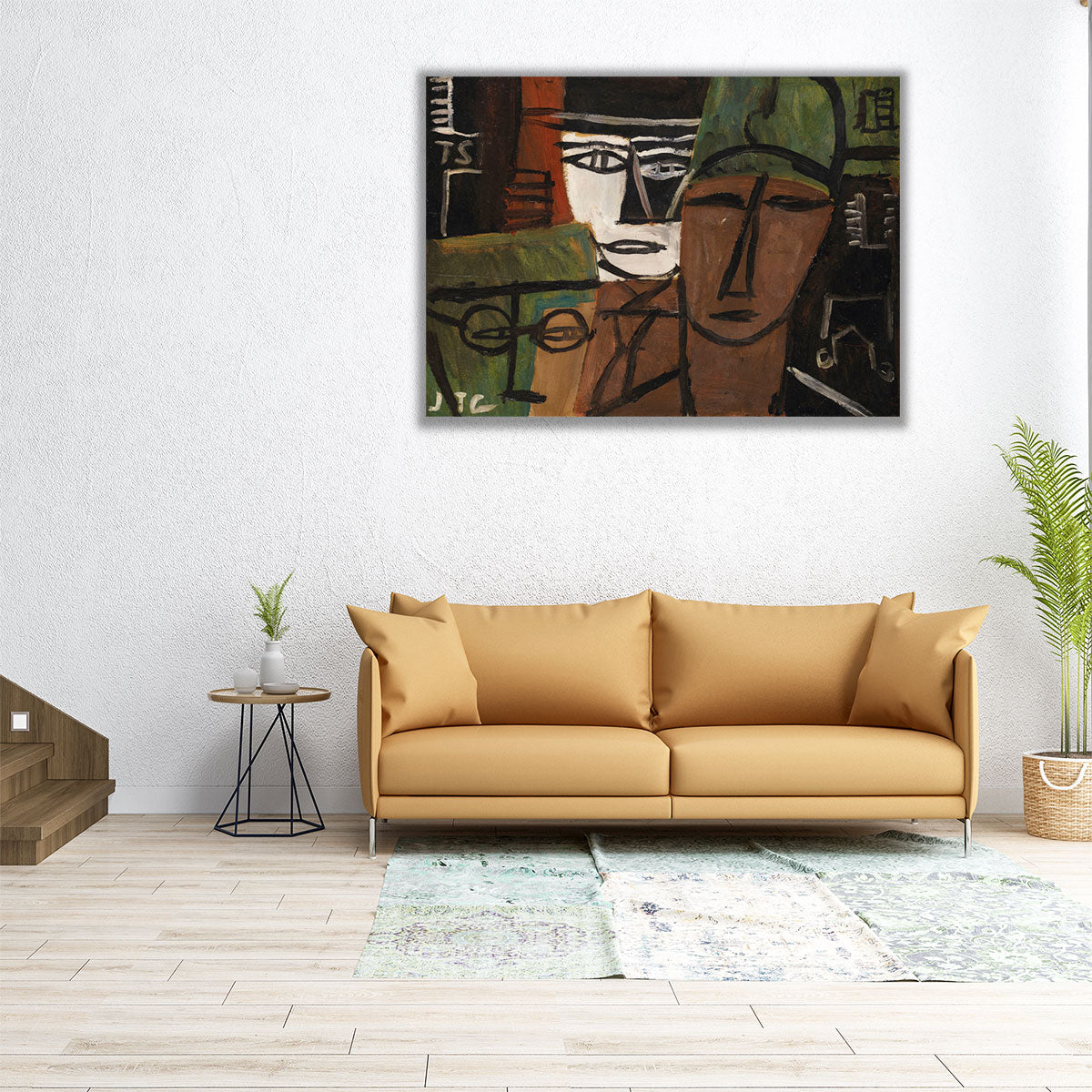 This artwork features stylized abstract face figurines rendered in green, brown, and black, evoking symbolic expression through a modernist lens.