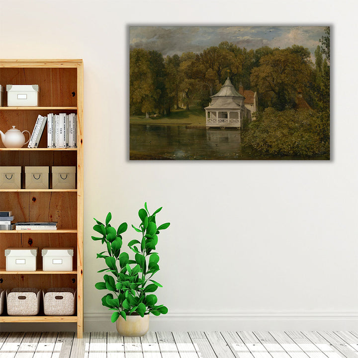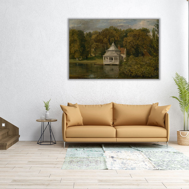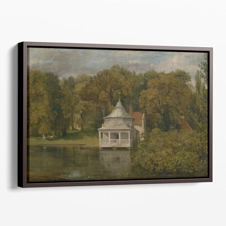 Green trees surround a riverside house in this classic-style artwork, blending calm tones and nature’s stillness in a timeless, neutral palette.
