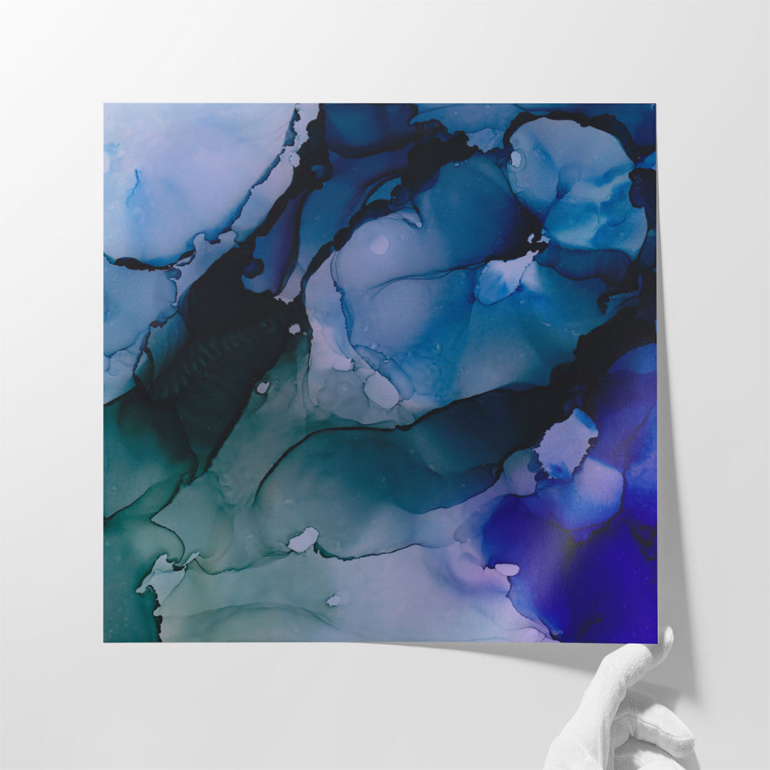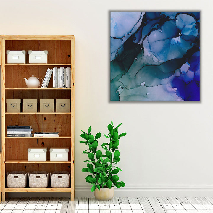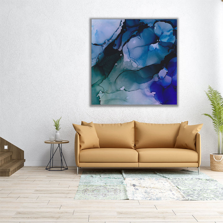 This blue abstract artwork showcases fluid textures and dynamic forms, evoking a sense of depth and emotion.