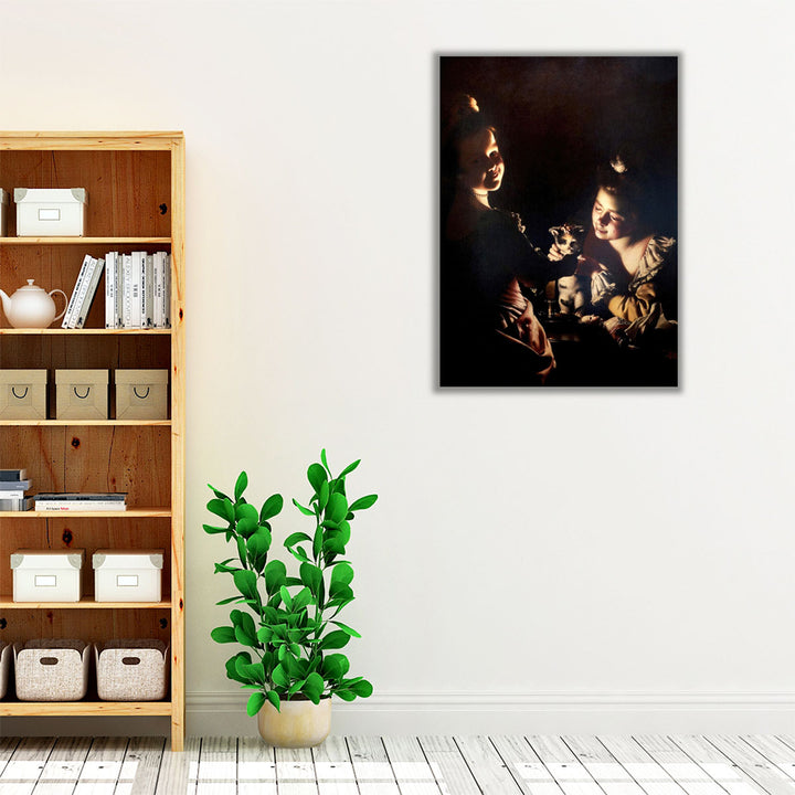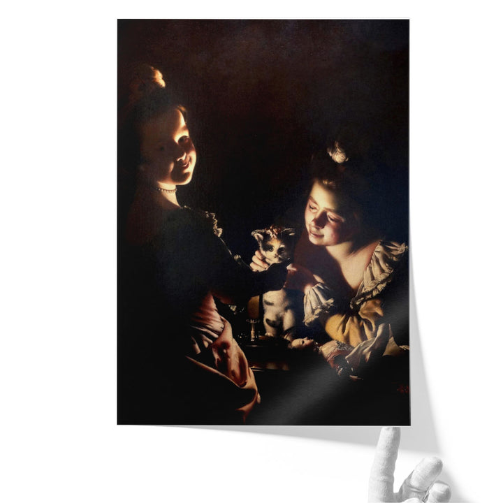 Two Girls Dressing a Kitten by Candlelight Canvas Wall Art by Joseph Wright of Derby.