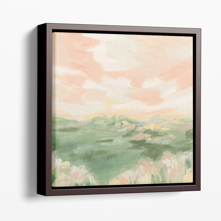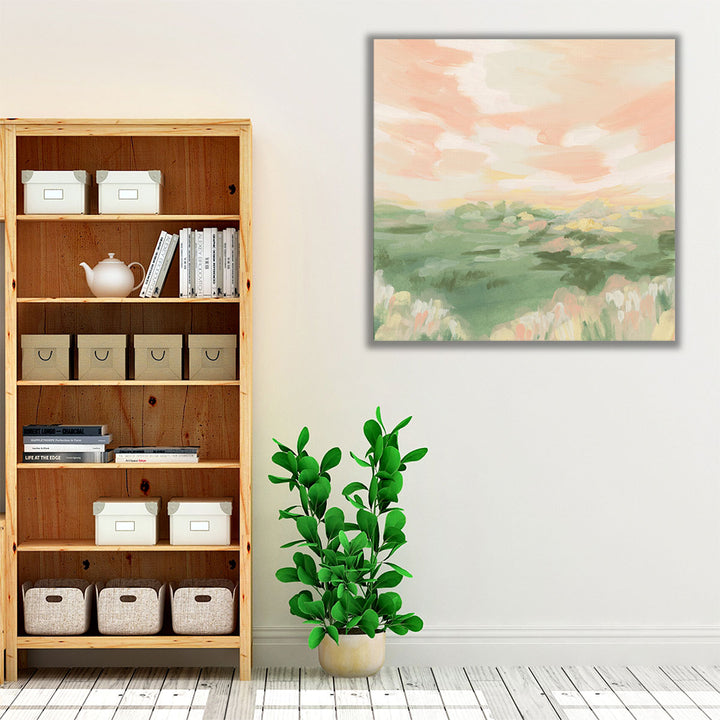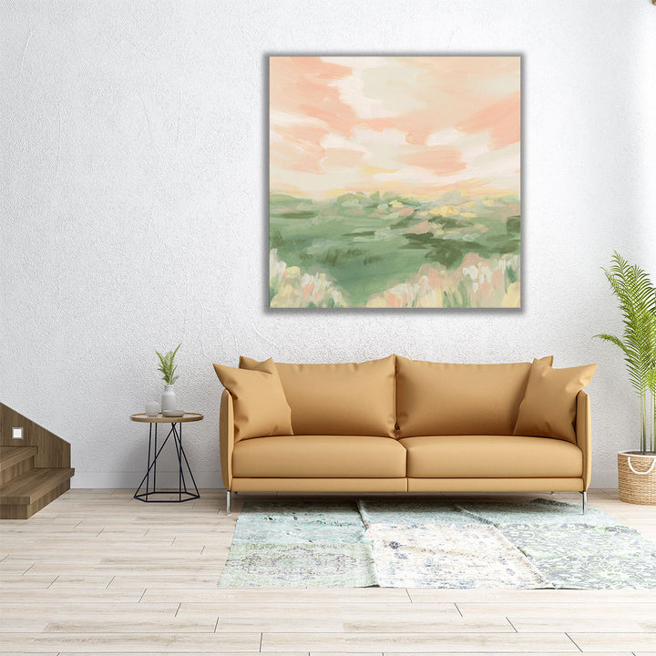 A scenic landscape with soothing shades of green and pink, embodying a peaceful and serene atmosphere.