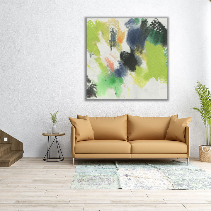 A striking abstract design in white, green, and neutral tones, with a dynamic abstract pattern.