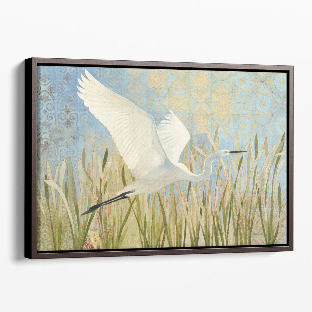 This stunning piece captures a graceful egret soaring over fields and grass, embodying the beauty of nature in motion.