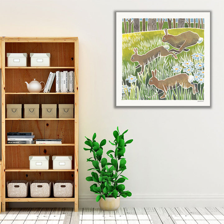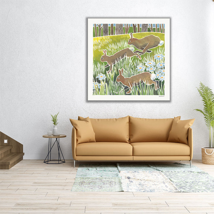 This delightful piece features a charming rabbit amidst vibrant grass and flowers, capturing the beauty of nature in your living space.