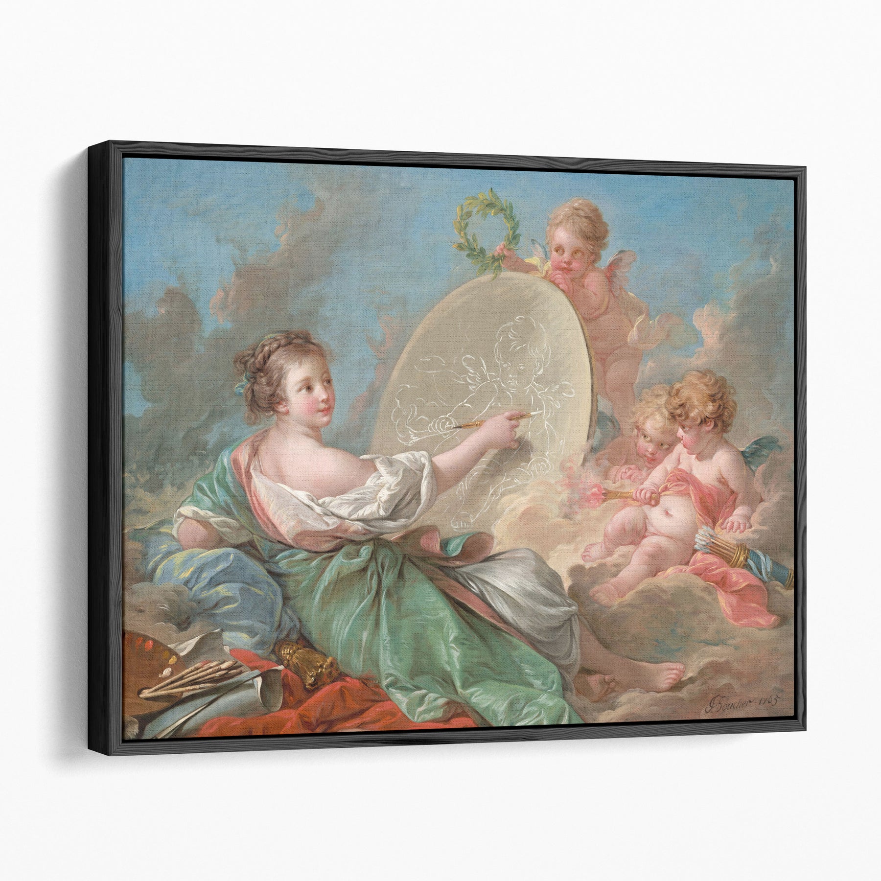 This Rococo allegory shows a draped woman symbolizing Painting, with putti, palettes, and laurel wreaths highlighting creativity and artistic triumph.