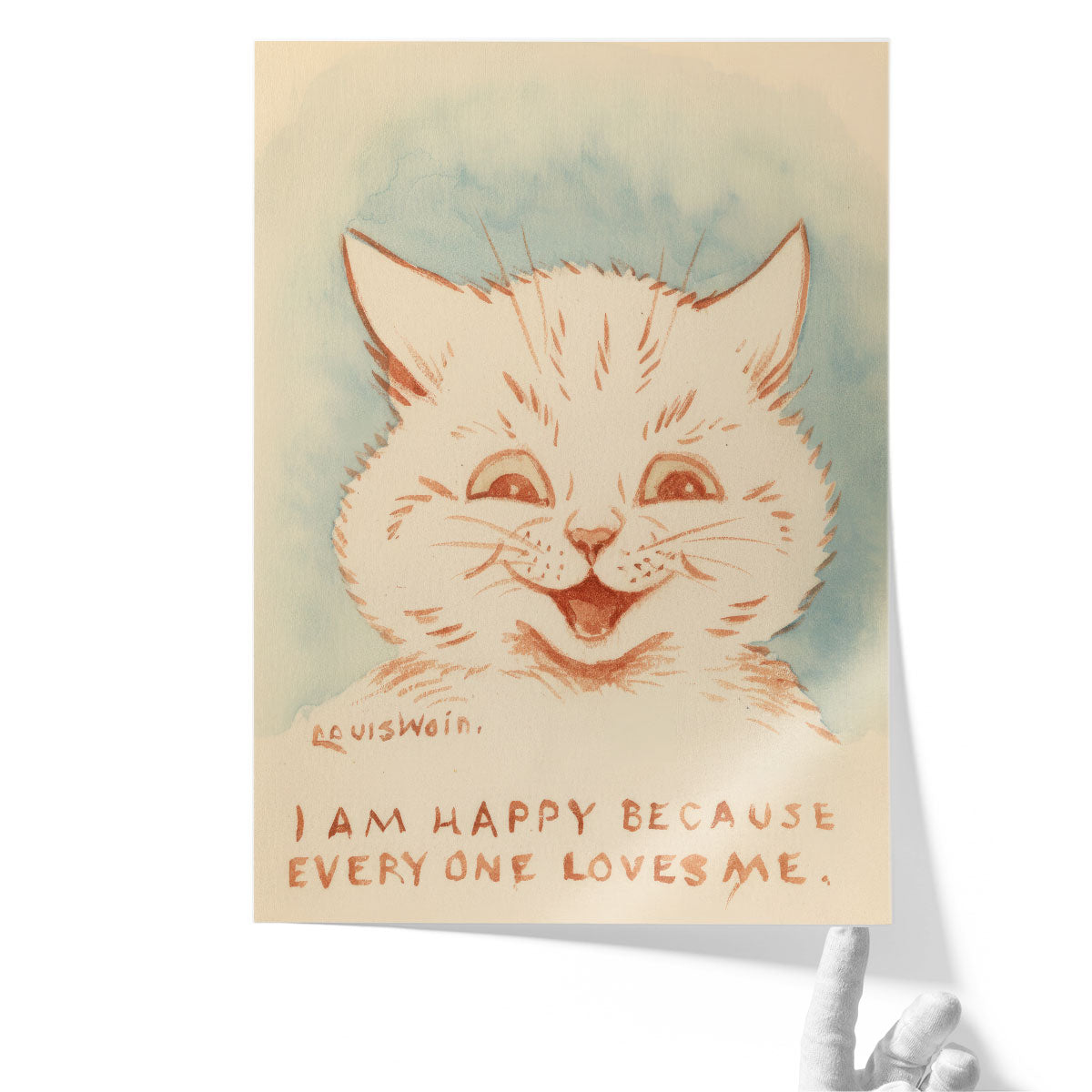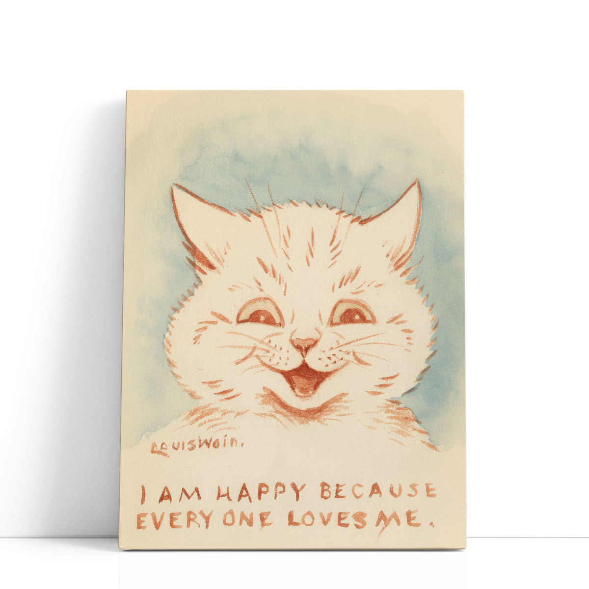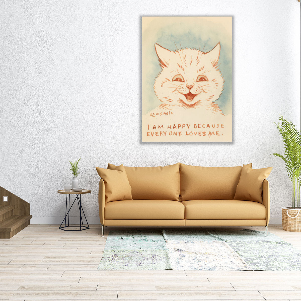 This playful piece features a neutral-toned cat with the cheerful phrase "I'm happy because everyone loves me," blending charm with lighthearted humor.