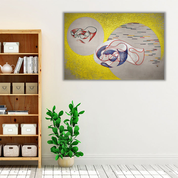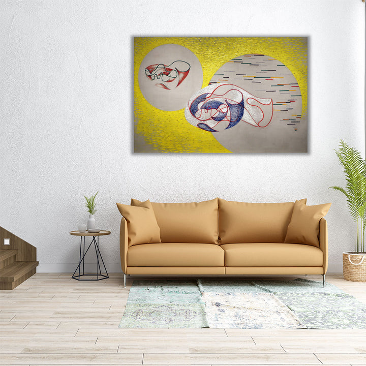 Radiating abstract classic style, the artwork brings yellow, gray, and neutral tones to enrich a modern living room with subtle elegance.