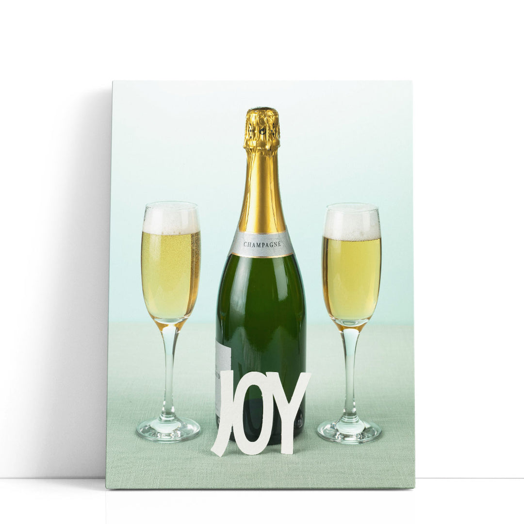 Champagne Bottle and Glasses with the Letters Joy Canvas Wall Art by Assaf Frank.