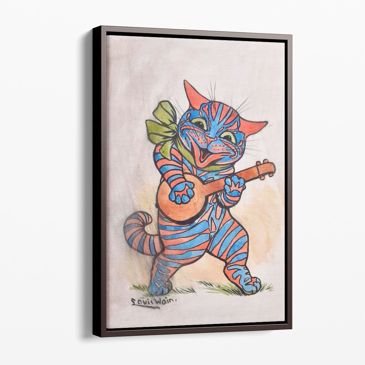 This colorful artwork shows a whimsical anthropomorphic cat joyfully strumming a lute-like instrument, blending playfulness with Wain’s signature style.