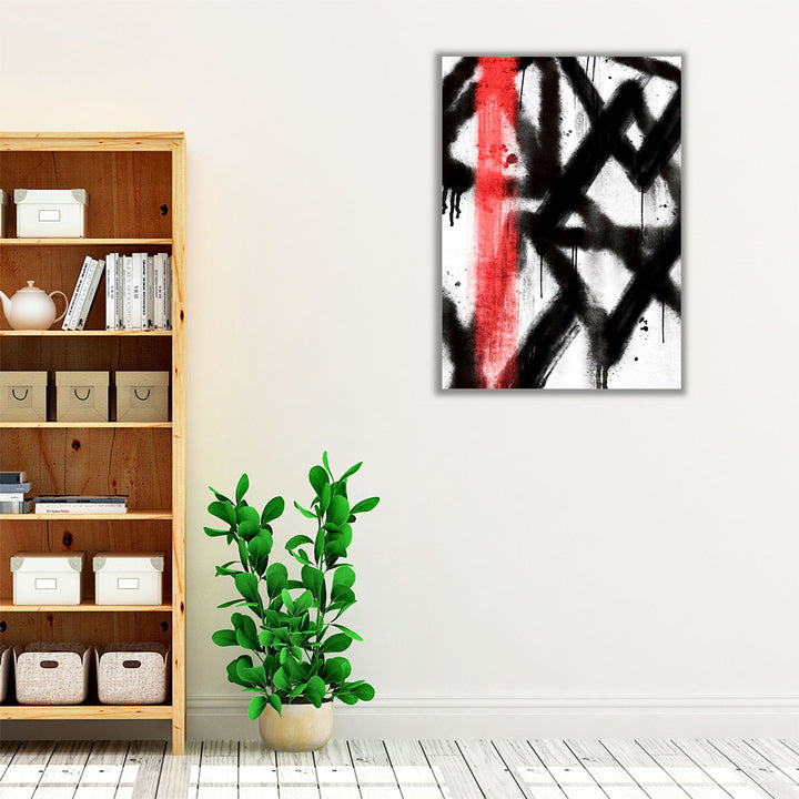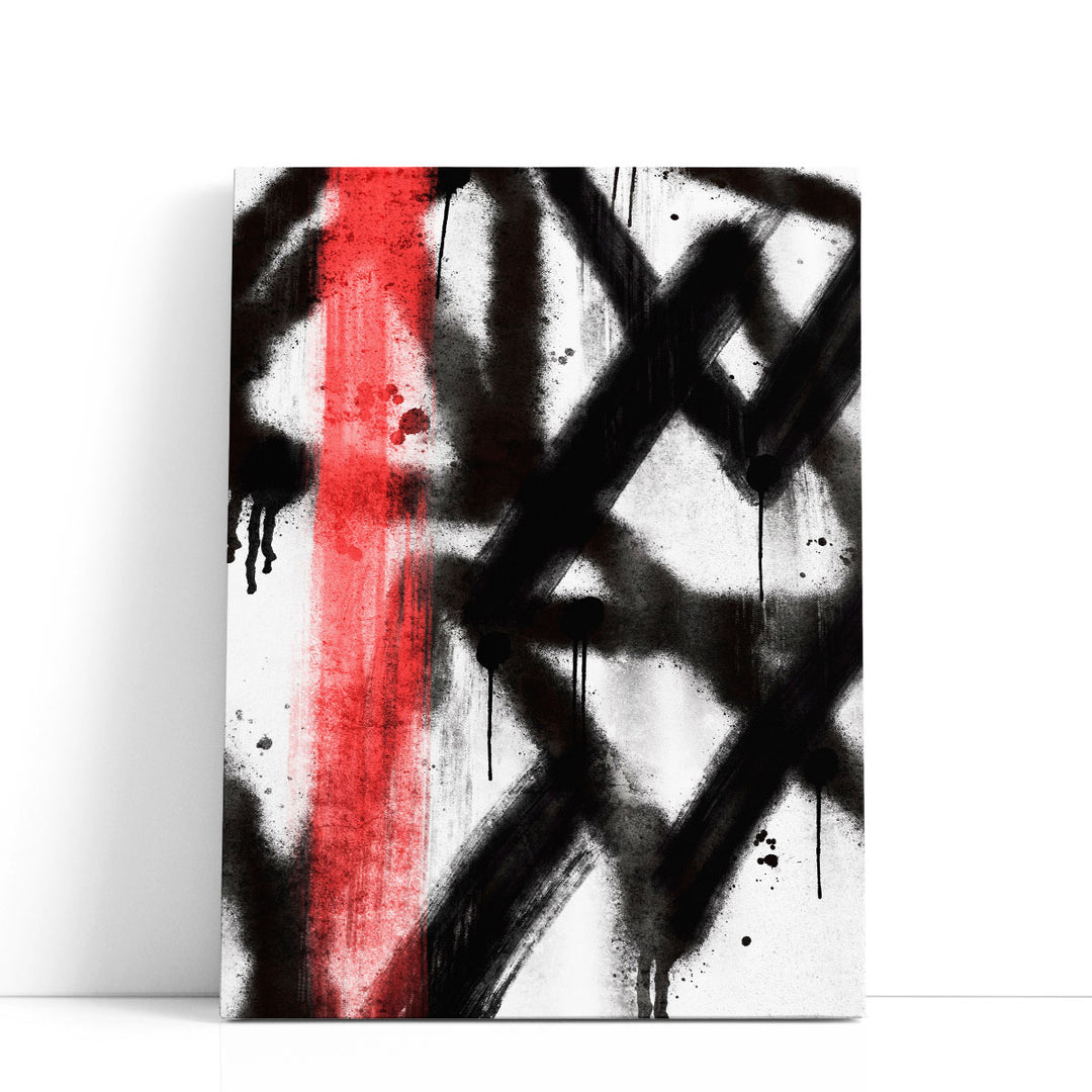 This abstract artwork captures dynamic energy with bold contrasts, creating a visually striking composition.