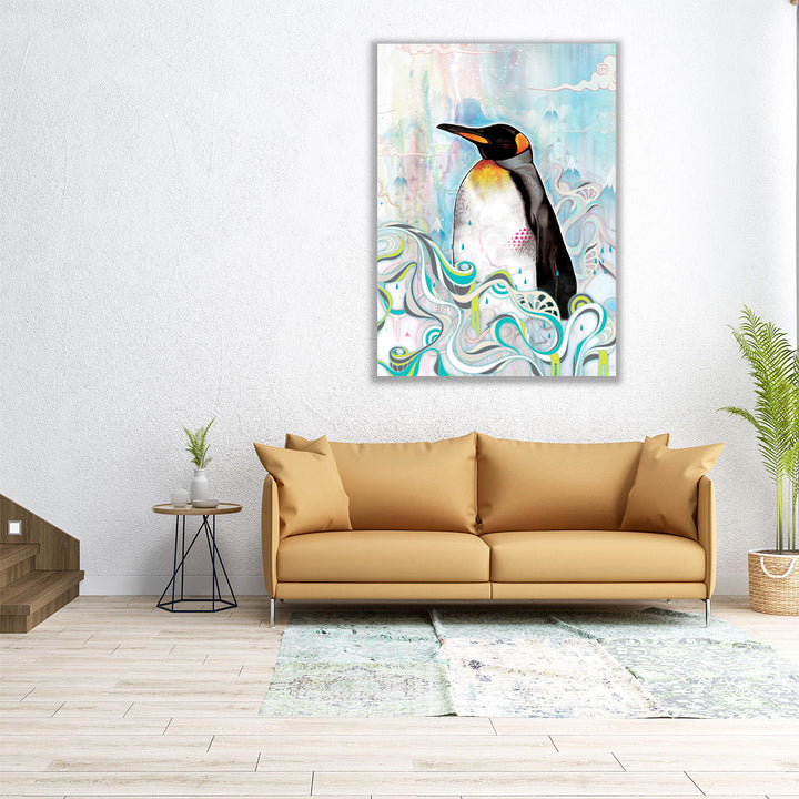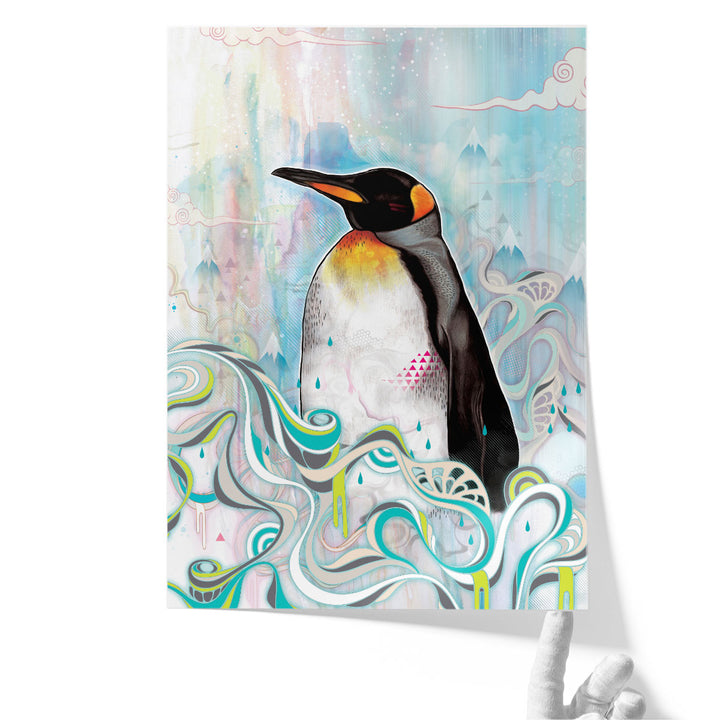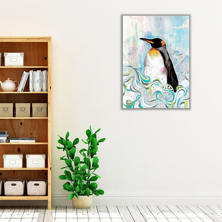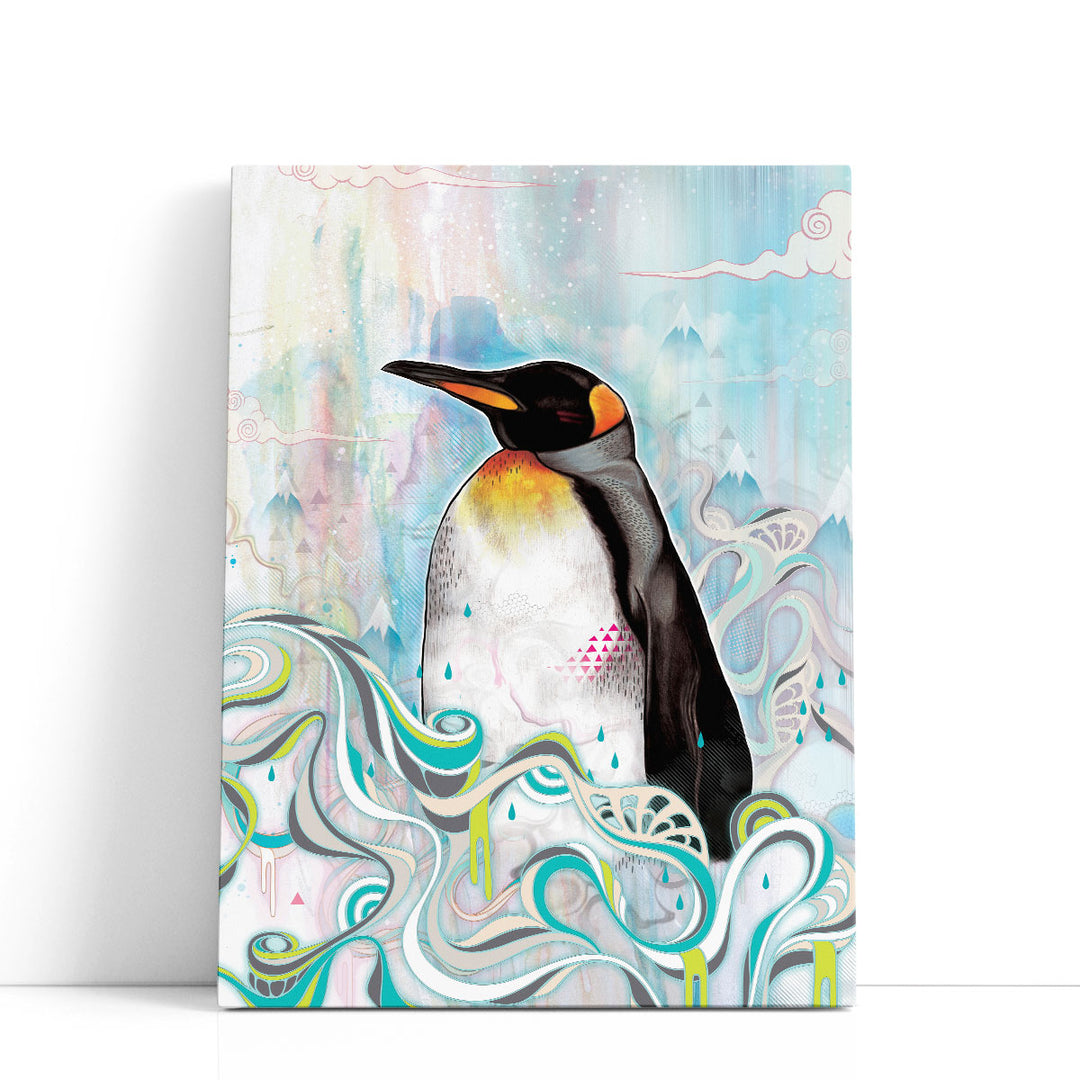 A black penguin stands boldly against a neutral background in this contemporary wildlife piece by Mat Miller.