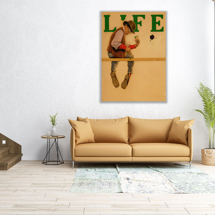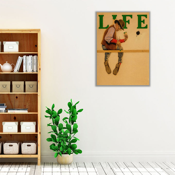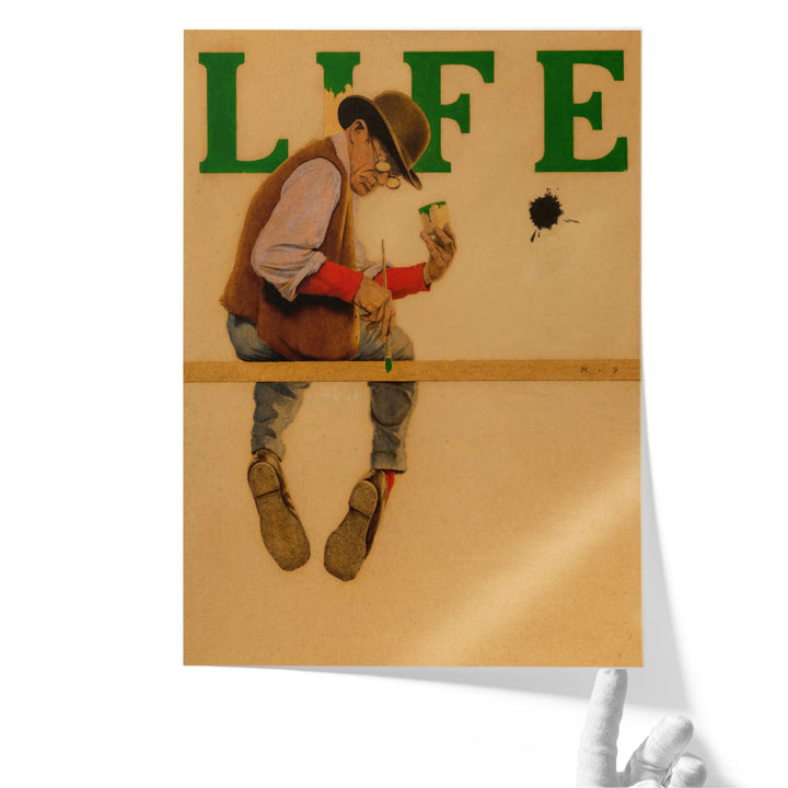 Life magazine cover scene with a humorous painter balanced on a beam, a Golden Age American illustration with witty vintage poster flair.