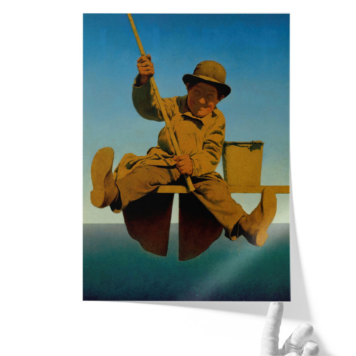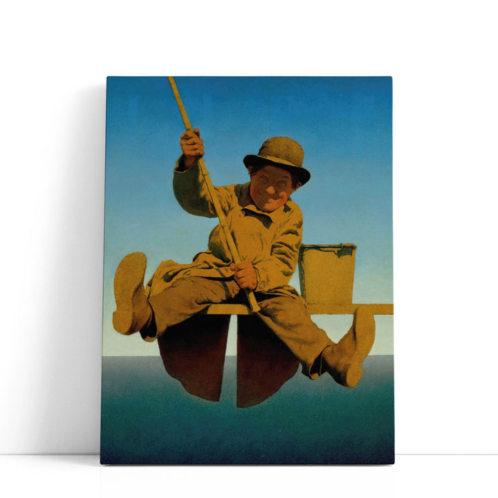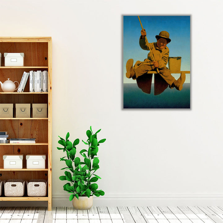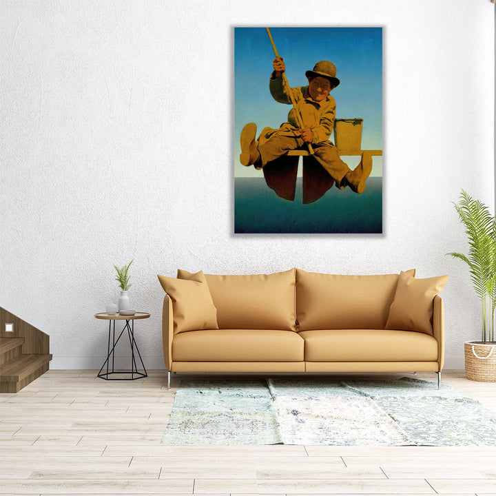 Boy fisherman balances on a pier beam in a whimsical seascape with a bright blue sky and lively American illustration energy.