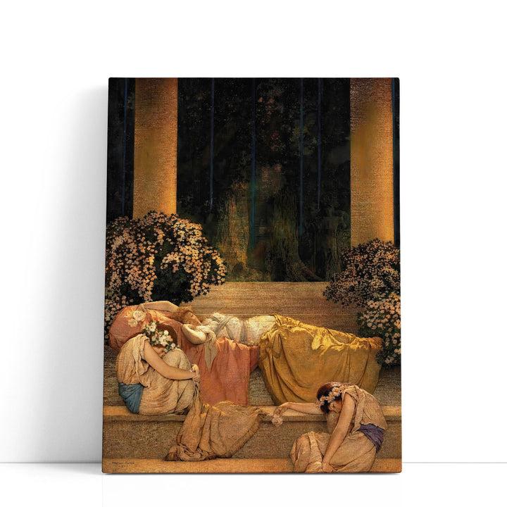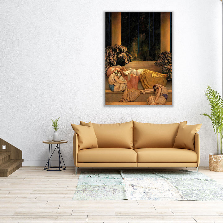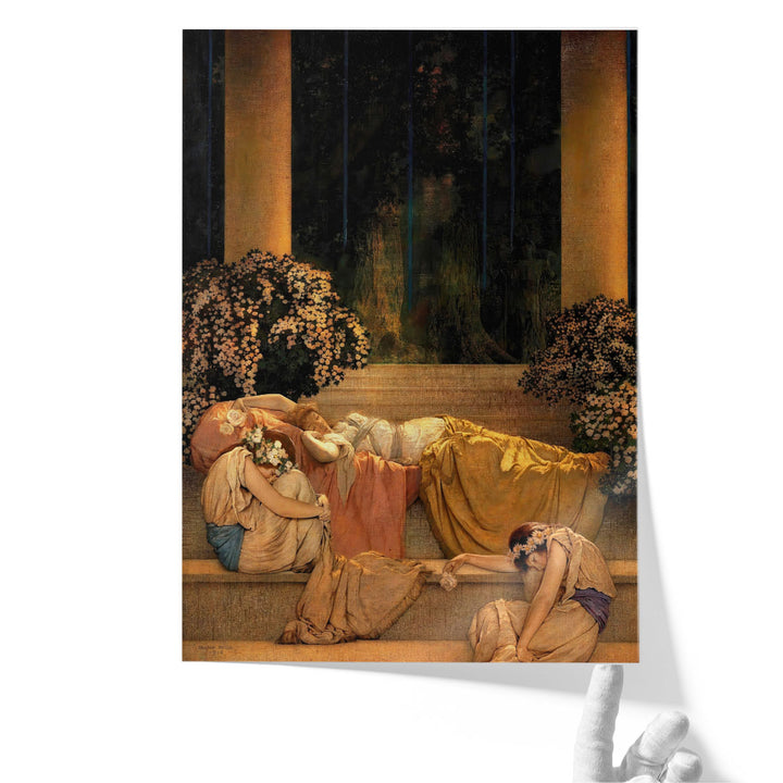 A classical fantasy tableau of sleeping maidens on temple steps, glowing columns and a floral garden in Parrish’s luminous, theatrical style.