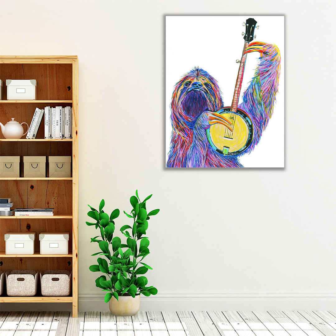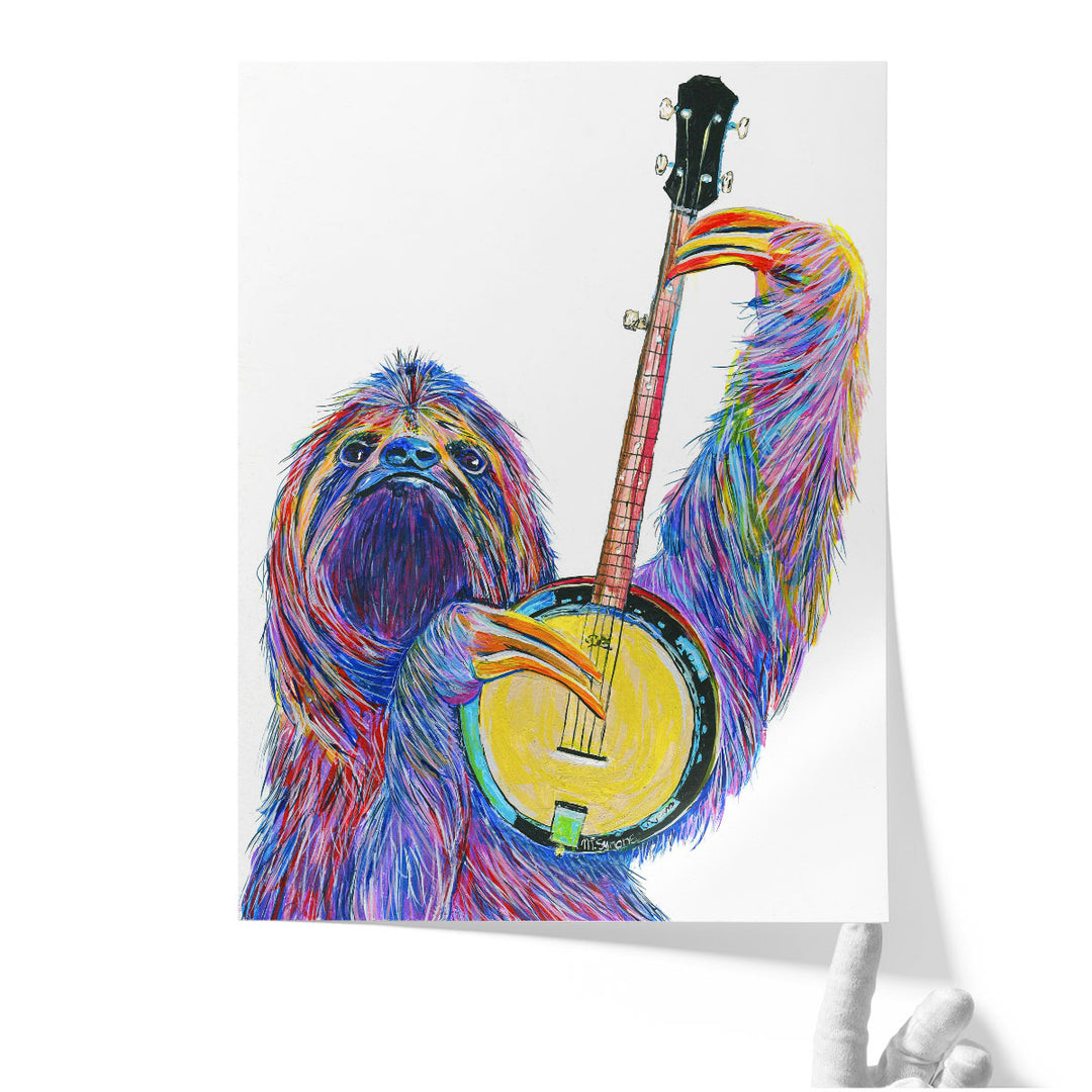 A whimsical sloth strums a banjo with relaxed charm, capturing a laid-back vibe in this playful and quirky animal-themed illustration.