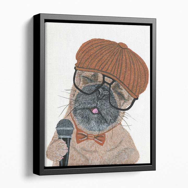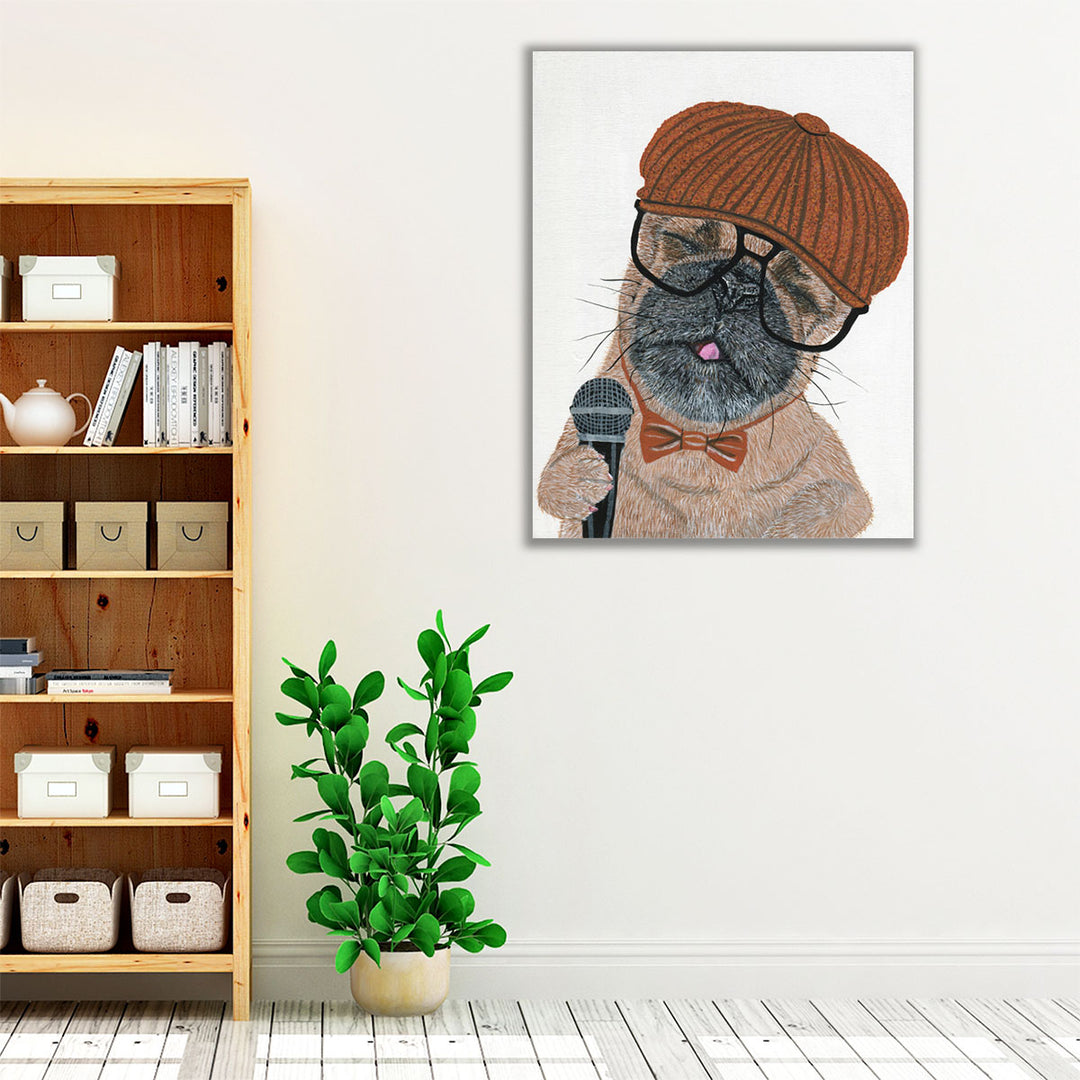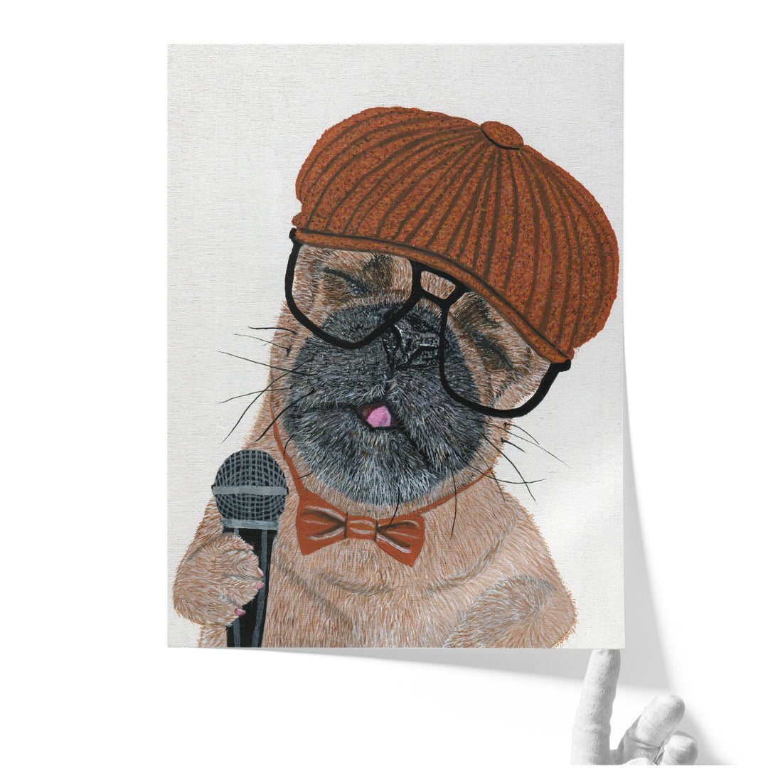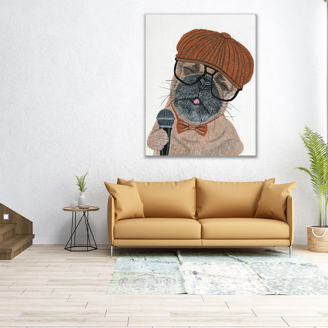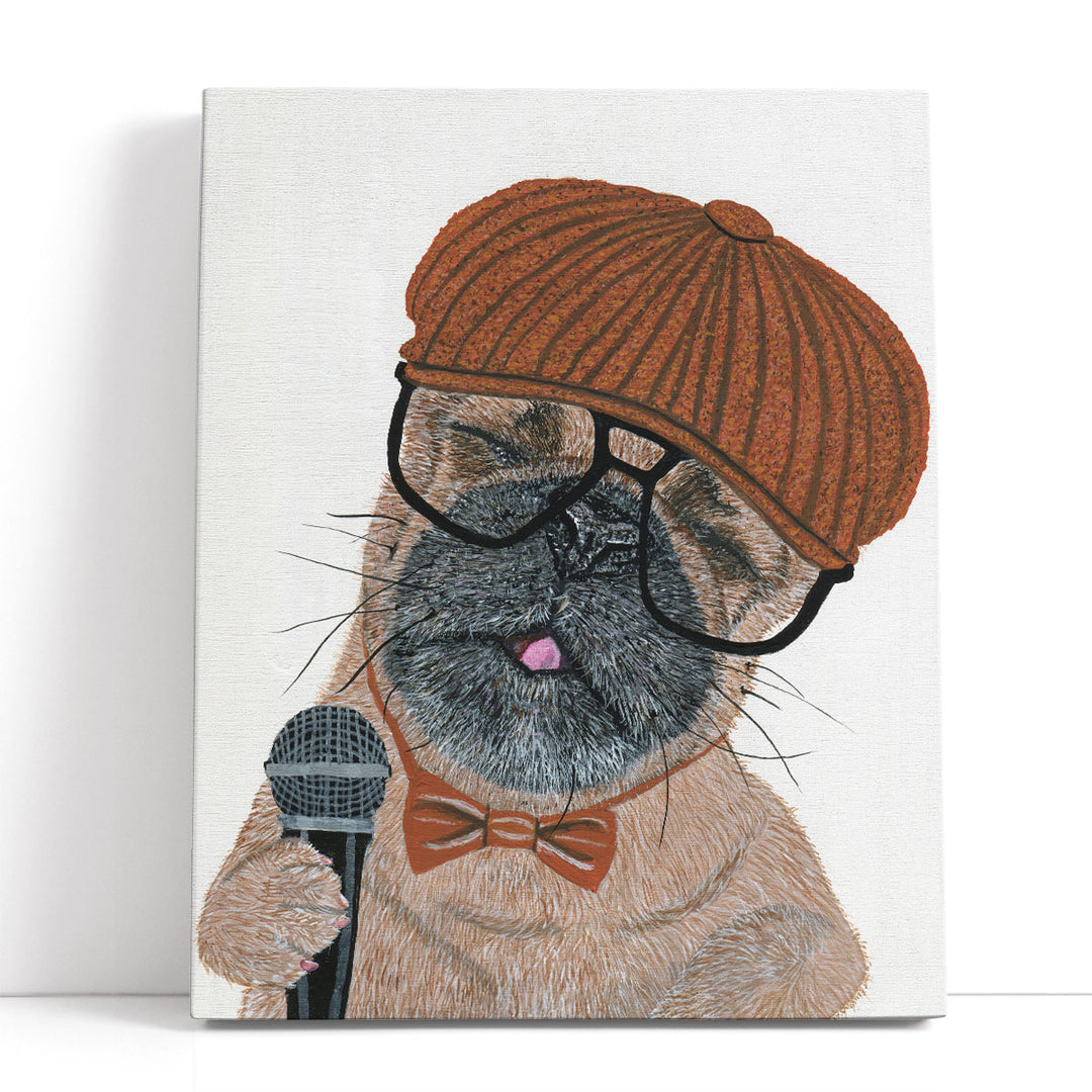 A cheerful depiction of a dog in a beanie hat captures a playful spirit through expressive brushwork and vibrant tones.