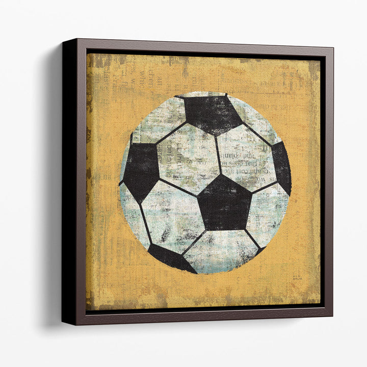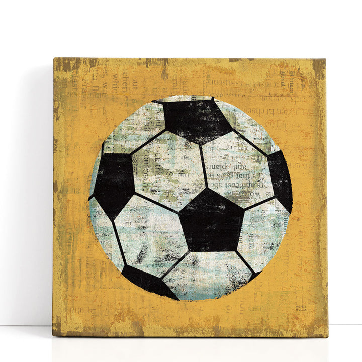 This dynamic artwork features a black and white soccer ball set against a vibrant yellow background, adding a sporty touch to any room.