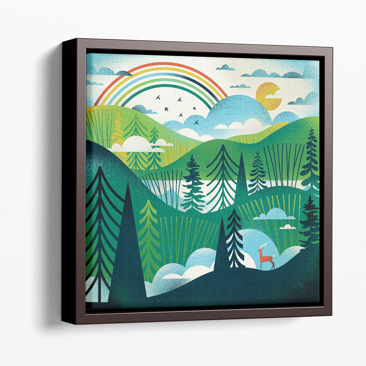 Lush green landscapes with floral touches depict serene hills and a majestic tree, showcasing a tranquil nature-inspired style.