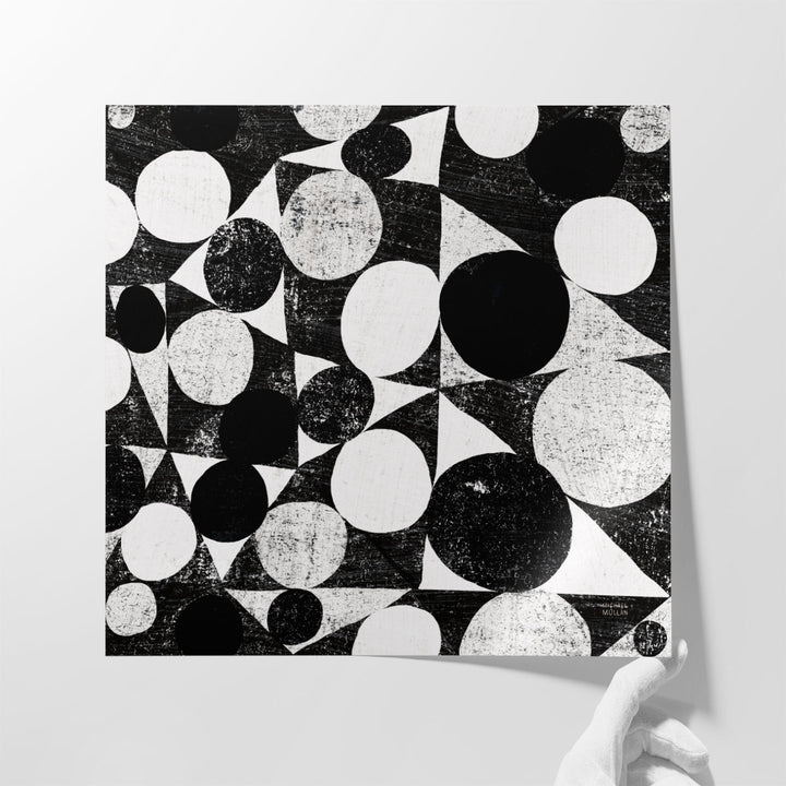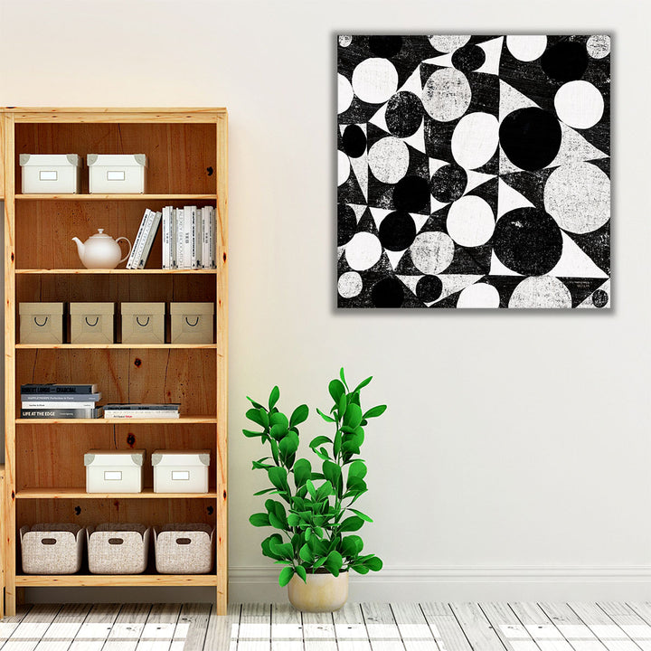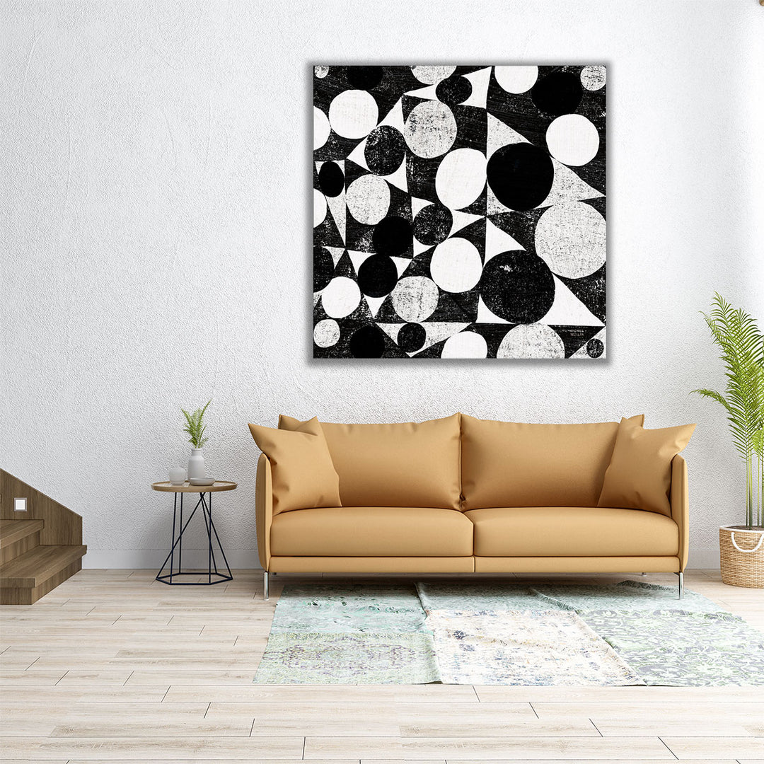 This abstract black-and-white pattern brings a bold, modern touch to any interior, adding dynamic visual interest.