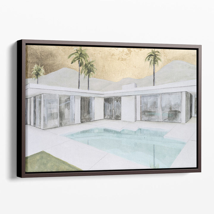 This stunning piece features a pool scene with the interior of a house, captured in a mid-century modern style with metallic accents.