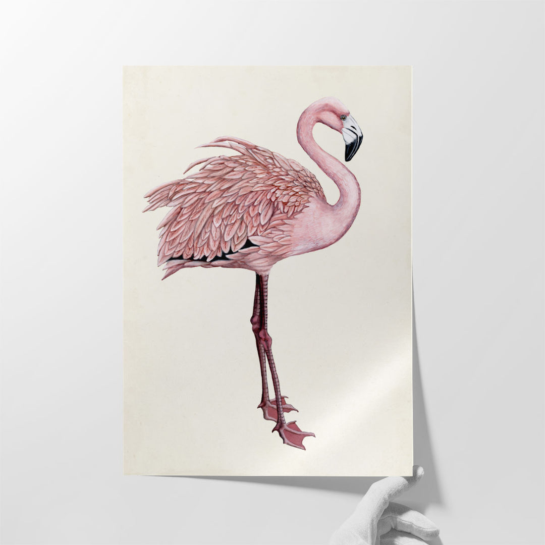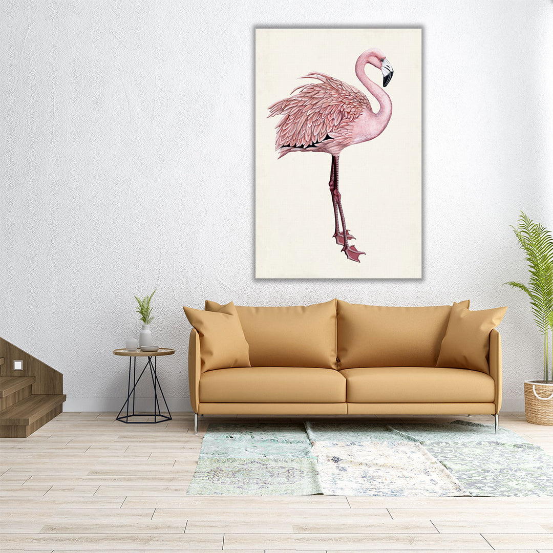 This artwork features a vibrant pink flamingo set against a clean white background, adding a touch of elegance and charm to your space.